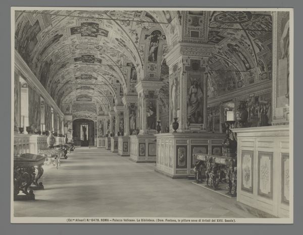 Curator: This gelatin silver print, entitled "Galerij in het Louvre, Parijs", was captured sometime between 1887 and 1900. The photographer signed only as X phot. What are your initial impressions? Editor: My first thought is "excess." The photograph is overwhelmingly opulent—all that ornamentation receding into the distance. The parquet floor looks almost liquid. Curator: It's quite a scene, isn't it? When viewed through a contemporary lens, the composition invites a broader conversation about museums and their roles in perpetuating specific power structures and colonial narratives through the act of display. Editor: I see your point. But at the same time, looking at the grain and tonality, I am drawn to the materiality of the gelatin silver print itself. Consider the labor involved in producing such a refined image, the alchemy of photography as it was practiced then. It connects the high art on display with the skills of production. Curator: Absolutely. And the image itself freezes a moment within a very specific space. "Galerij in het Louvre, Paris" begs questions about who has access to these spaces. Who is welcome and whose stories are amplified within its walls, particularly in an era grappling with issues of social inequality? Editor: It is all there—opulence, access, and materiality, all framed by the gaze of the photographer and then fixed with silver on paper. The high-resolution of the photo is interesting, too, showing not only the sculptures, but also the wood grain and individual brushstrokes within paintings hanging on the wall. The craft extends to architecture. Curator: Yes, this artwork invites us to explore how identity and status intersect with place and representation. What stories are told here? And whose perspectives are centered—or silenced—within this seemingly neutral gallery space? Editor: Seeing these treasures carefully displayed within this gilded hall makes me ponder on the relationship between art, labor, and history. Curator: Exactly. It compels us to critically reflect on how art and museums participate in shaping our cultural narratives, while asking crucial questions about historical and ongoing power dynamics. Editor: It’s a fascinating and very ornate reminder to consider all the elements and ideas behind what we consume.