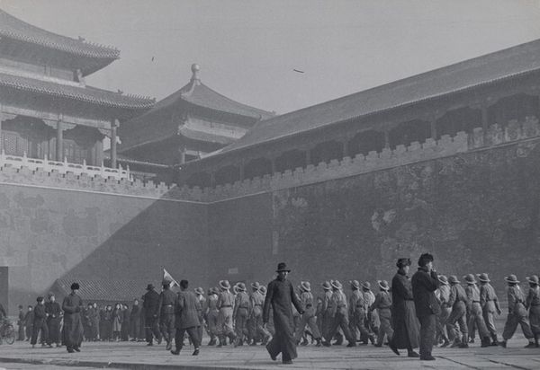 Henri Cartier-Bresson made this photograph, "Army Day" Parade, in the Forbidden City, Beijing, sometime in the mid-20th century. The greyscale palette gives it a timeless quality, like a memory faded but not forgotten, and you can really sense the quickness of the moment, how his images were about feeling and the experience of the shot. Think about the guy with the camera in the foreground, he's just beaming! His joy is palpable. And then look at the figures in the background, so regimented, serious, and still. The texture of the stone in the Forbidden City looks almost soft, blurred, and hazy compared to the sharp, clear lines of the people in the foreground. I wonder if they noticed him? It's this kind of visual and emotional contrast that makes Cartier-Bresson so interesting. It feels like he’s not trying to give us a fixed answer, just pointing to a moment in time and letting us figure it out for ourselves. It reminds me a bit of Robert Frank, another street photographer who found beauty in the everyday and wasn't afraid to capture the messy, complicated reality of life.