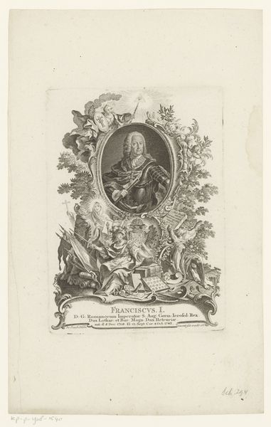 Curator: Today we are looking at a Baroque print entitled “Heilige Peregrine Laziosi,” created by Johann Christoph Winkler, around 1717 to 1770. Editor: My immediate reaction is that this engraving feels densely packed, almost overwhelmed with symbolic imagery. The central figure looks calm, in contrast to the busyness surrounding him. Curator: Exactly. Peregrine Laziosi, as a saint, is of course a powerful symbolic figure in the church's narrative. Note the prominence given to Christ on the Cross at the top right, contrasted with Saint Peregrine and allusions to his personal story below him. Editor: Structurally, the central portrait dominates. The saint's composed posture is framed by this chaotic collection of religious objects and the narratives, creating a tension between the stillness of faith and the surrounding world. The textures are impressive; observe the hatching and cross-hatching that create shadows and depth, adding a tangible quality to the ethereal subjects represented. Curator: Yes, Winkler uses traditional symbolic shorthand. Each object carries profound meaning within a visual tradition – the instruments of Christ’s Passion, the smaller vignettes that show various episodes from the saint’s life. In a way, the image synthesizes collective memory and a shared visual language. Editor: Yet, despite the visual weight of the symbols and narratives, the composition leads the eye back to Peregrine. There’s a delicate balance struck here—the artist doesn't let the smaller surrounding images overwhelm the core subject. Curator: The positioning is so important – the upper and lower registers, the deliberate framing devices – they’re all orchestrating the viewer’s experience of this particular historical figure. Saint Peregrine's figure almost seems like an unveiling. Editor: Thinking about Winkler's choices in rendering the scene adds so much, doesn't it? The precision in capturing the details of Peregrine's robes, versus how he models the landscape—everything plays a role in our understanding and connection to the subject. Curator: Indeed, in engaging with such prints we have a chance to consider not only the specific story of Peregrine Laziosi but also the endurance and evolution of visual motifs and what they continue to communicate across centuries. Editor: Agreed, diving into the formal choices provides access to wider understandings about religion and Baroque aesthetics that shape and are shaped by artists and their times.