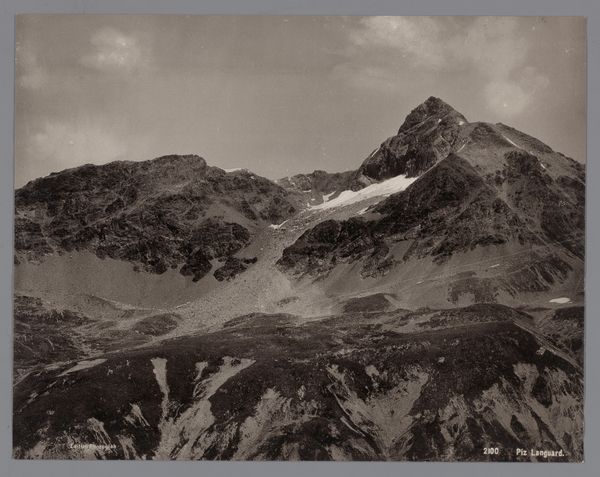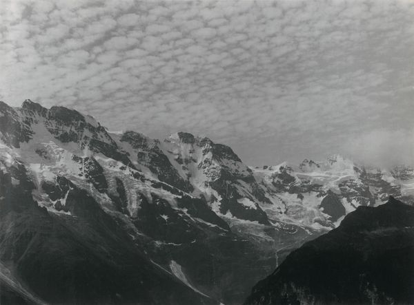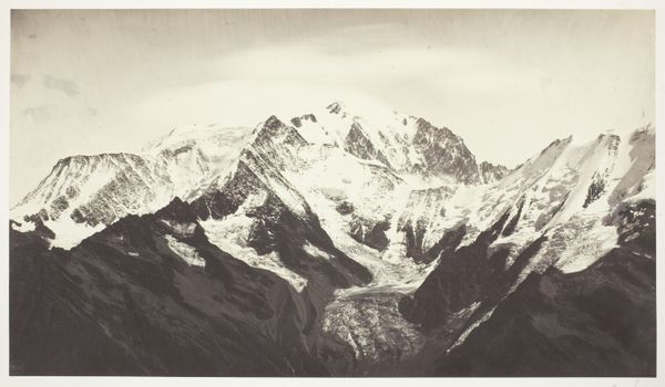 Editor: This is “Schweiz, Kanton Wallis, Rhonegletscher” or "Switzerland, Canton of Valais, Rhone Glacier," a gelatin-silver print by Bisson Frères, dating from around 1859 to 1862. It has a monumental feel – it makes you feel very small. What do you see in this piece? Curator: What strikes me is how this photograph, seemingly a straightforward landscape, also acts as a potent commentary on humanity's relationship with nature, particularly in the face of environmental change. Consider the socio-political context: this image was created during a period of intense industrialization and expansion. Editor: How does that tie in? Curator: Well, these early photographs of glaciers served not only as scientific documents, recording their scale and majesty, but also implicitly as warnings. They capture a moment in time, a fragile beauty threatened by human activity, even then. Can we consider landscape photography to be a form of early environmental activism, subtly challenging dominant power structures and advocating for a more sustainable approach? Editor: That’s a powerful idea! I hadn’t thought about it in terms of activism. It does make you think about our role in preserving these landscapes. Curator: Exactly! It prompts us to question how visual culture shapes our understanding of environmental issues and, hopefully, inspires action. It is a fusion of science and politics. Editor: This makes me think about how relevant it is today! I came to this piece thinking simply about aesthetic and technical skill, but now I see this photo as something deeply ingrained with social commentary and awareness. Curator: Precisely. And it is these dialogues that enrich our understanding of art's role within broader cultural narratives.