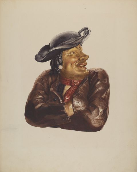 Curator: So, let's talk about this watercolor drawing. It's called "Toy Bank: Policeman," and it's from around 1939 by Walter Hochstrasser. Editor: He looks…deflated. Not quite imposing, despite the uniform and truncheon. There’s something about that gaze, or the slight downturn of his mouth... Curator: Yes! There's a subtle melancholy there, isn't there? The caricature style really emphasizes it. It's a portrait of a toy, essentially. All rendered in watercolor. Notice how the light catches the contours of the figure. There are also these subtle browns and coppers mixing with the overall blue which is particularly captivating to the eye. Editor: The color palette is intriguing. The blues create a sense of order and authority, obviously alluding to the subject of the policeman. But that’s subtly undermined by the artist. See how he is not just solid blue but incorporates all these flecks of copper or brown in his outfit and his face. It creates a kind of mottled effect that speaks against total order, and gives it some nuance, complexity... Curator: Exactly! And it is on paper. The choice to portray a potentially solid, heavy object—a toy bank presumably made of metal—using delicate watercolors is quite a compelling paradox, don't you think? It's like taking something serious and making it feel approachable. Editor: Or making something functional and transforming it into something purely representational. It’s now all surface and sheen. I can’t help but think there’s a commentary about power dynamics embedded here. Especially with the oversized boots on him... Curator: A lot of Hochstrasser's work from this period is focused on portraiture and caricature. This really seems to explore ideas around authority and even childhood memories. Editor: It almost invites us to reconsider what power looks like and where it resides, especially through the eyes of someone playing with this as a toy bank. Almost like reimagining the figures who we once thought possessed unwavering influence as flawed, and subject to time… fading as we all eventually do. Curator: Beautifully said! It leaves me thinking about the transience of symbols of authority and the layers of meaning an image can hold, just in a humble, little watercolour of a policeman.