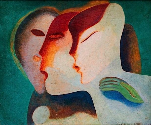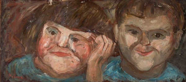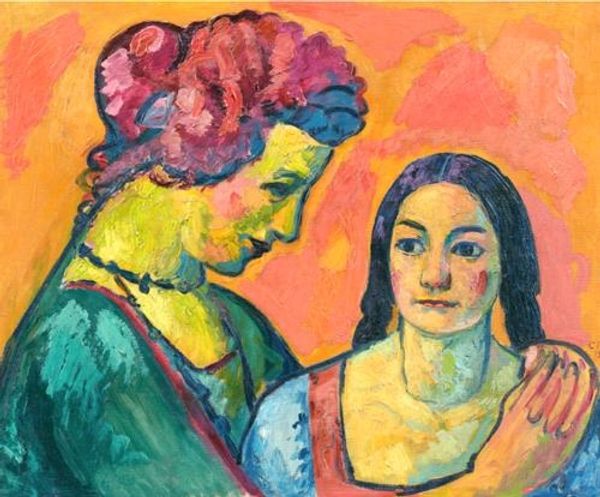 Charles Blackman created this painting, ‘Two Schoolgirls’, using bold colors and simplified forms that draw us into a world of subtle emotional complexity. The work is defined by its striking formal arrangement: two figures tightly composed against a flat, vibrant blue background. Blackman destabilizes traditional portraiture by focusing less on realistic representation and more on the structural elements of form and color. Notice how the faces of the figures are rendered with angular lines and flattened planes. This reduction to essential forms invites us to consider the symbolic weight of each shape and hue. The artist uses color not descriptively, but to evoke mood and psychological depth. Through semiotic analysis, the light blue background might signify openness, yet the constrained poses of the girls, locked together, suggest a tension between freedom and confinement. We see the faces averted from each other, leading to questions about communication and isolation. The structural tension in this painting, between form and emotion, speaks to the enduring power of art to explore human relationships.