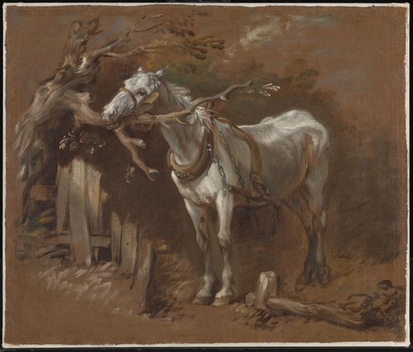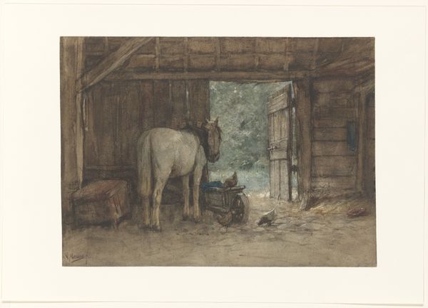 Editor: Here we have Anton Mauve's watercolor, "Praatje op een landweg," created sometime between 1848 and 1888. It feels so quiet, a brief pause in the day captured with such delicate washes of color. What's your interpretation of this scene? Curator: It's a quintessential example of the Hague School's interest in rural life, isn't it? Look at how Mauve depicts the figures; they're not idealized or heroic, but ordinary people going about their daily routines. The figures are clearly members of the lower class of Dutch society during that period, a common subject of genre paintings and popular culture, which sought to depict them as simple and virtuous. Editor: I hadn't considered it in the context of genre paintings, I was too focused on the horses. Is there anything significant about their presence? Curator: The horses are integral to the image’s meaning, connecting these people to their livelihoods, their place in the rural economy. Consider too the relationship between the painting and the rising urban audiences consuming these images of "authentic" rural life. Do you see an inherent tension there? Editor: I see what you mean – it's like a nostalgic projection of a simpler past onto a present undergoing rapid industrialization. They likely couldn’t see any authenticity in these paintings. Curator: Precisely. And how do you think Mauve’s choice of watercolor contributes to this feeling? Editor: Well, it seems to enhance the romantic aspect. The medium softens the details, creating this diffused light which does romanticize the moment, especially for someone looking at it much later. It becomes idealized rather than something true. Curator: Exactly. It demonstrates how a seemingly simple genre scene reflects broader socio-political forces and anxieties of the period, playing into the way in which city life changed in that era. Editor: I see how deeply the setting and social context are embedded in the artwork; It gives new weight to something that looked simply idyllic at first glance. Curator: And hopefully inspires a greater appreciation for the dialogue between the painting and society, influencing each other in the long run.