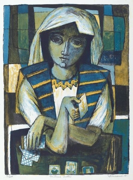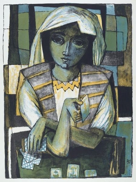 Curator: The somber countenance captured in Benton Spruance's 1954 lithograph, "Fortune Teller", immediately evokes a sense of gravitas, wouldn't you agree? Editor: Indeed. The limited palette amplifies that mood, adding to the intensity of the figure’s gaze. I’m struck by the prominence of the cards; they are more geometric than mystical. Curator: Absolutely. Spruance, deeply engaged with social issues, often used printmaking to explore themes of social alienation and anxiety. Consider the time. The Cold War, and McCarthyism were omnipresent. How does this image resonate with these themes, considering the social skepticism surrounding those who claimed unique access to “truth"? Editor: That makes perfect sense. The cards themselves could symbolize fate, manipulated by forces both seen and unseen—a subtle nod to the political manipulations of the era. The head covering almost alludes to ritual but reads as if her sight itself is obscured. It invites considerations of belief, truth and trust and how easily these things can be questioned. Curator: Furthermore, during this period, the proliferation of mass media significantly shaped public opinion and discourse. Printmaking, like Spruance’s lithograph, occupied a unique position between art and communication. Do you think the subject, who works in the liminal space between knowledge and speculation, mirrors the state of uncertainty and societal searching that the artwork responds to? Editor: Precisely. What’s also noteworthy is how he used symbolism in this and other works—drawing from a range of religious, mythical and literary motifs—but updated in ways that reflect post-war disillusionment. She looks trapped not enlightened by any of her “insights”. Curator: Well, delving into "Fortune Teller," through the lens of cultural anxieties offers us such insights. I see this piece now not just as a character study but a meditation on the unease of the atomic age. Editor: Agreed. The starkness serves as a stark reminder of a period fraught with anxiety—transformed, and made tangible by symbolic interpretation and clever deployment of reductive formal means.
