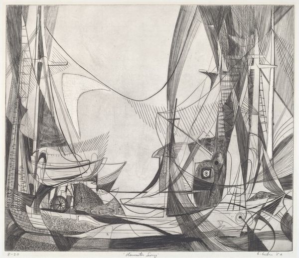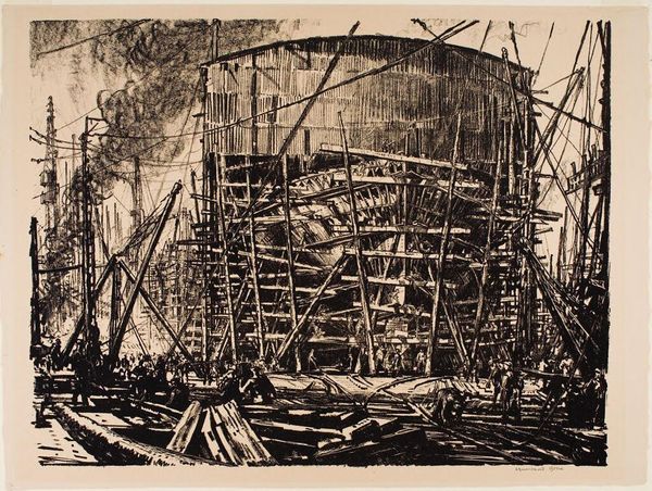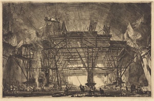 Editor: Sir Muirhead Bone’s "The British Museum Reading Room, May 1907" shows the iconic space under construction. It's all scaffolding and labor. What strikes you about Bone's depiction? Curator: The print foregrounds the labor of building, the materiality of the Reading Room itself. Bone highlights the consumption of resources, the sheer effort required to realize architectural ambition. How does this challenge traditional notions of art? Editor: I see your point. It’s not just about the finished architecture, but also the process and the workers. Thanks. Curator: Precisely. It asks us to consider the social context embedded in every seemingly grand edifice.
