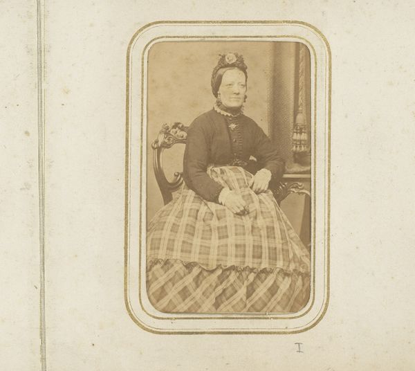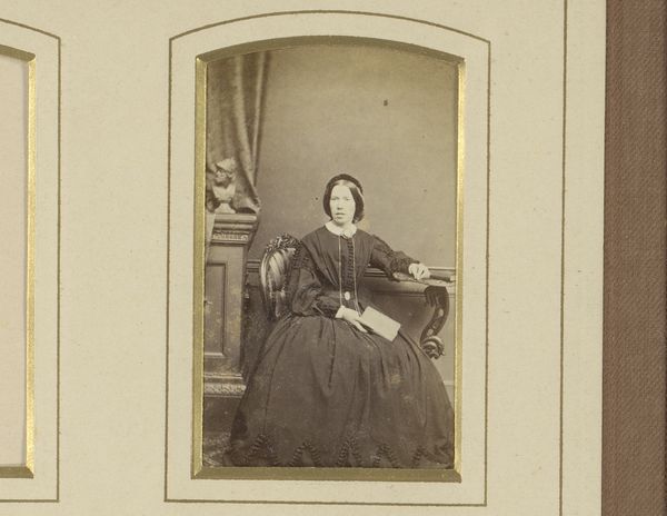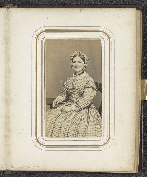 Curator: Here we have "Portret van een zittende vrouw, mogelijk Amanda Hedberg," a photograph created sometime between 1855 and 1890, attributed to Rosalie Sophie Sjöman. Editor: Wow, that's a mouthful. But first impression? It's got this eerie calm, like she’s eternally waiting for tea. The sepia tones amplify the feeling. Curator: The Realism style captures the details of the sitter's attire and the environment, placing emphasis on the middle-class sensibilities. Consider the context: photography during this period was gaining popularity, enabling access to portraiture for the bourgeoisie and expanding the modes for visual representation. Editor: True. You get a strong sense of the sitter, but I wonder what her actual thoughts were in that moment? Was she relaxed, or trying to hold it together? What was her reality? I wish portraits could whisper their secrets. The pose, it’s so composed. Controlled. Curator: Indeed. The photograph signifies not just an individual likeness but broader narratives surrounding women's roles, class, and representation. What do the tight ringlets pulled behind her ears and lace signify in relationship to other women during this time? Were their limitations or performative power found in those roles? Editor: I see what you mean! It's all a sign! Even that oval frame adds to that sensation of seeing into someone's perfectly framed life. And perhaps not a whole life, just a sliver she chose to share with the world. Curator: So, thinking about Amanda Hedberg, or whoever this person may be, is her carefully styled dress communicating social respectability, economic stability, or personal identity? Her posture, although conventional, communicates perhaps more rigidity. Or it speaks to our understanding of nineteenth-century culture. Editor: Right, maybe this wasn’t meant for casual display. Like maybe it was for distant family only to see. This image feels private in some weird way now. Curator: Considering how gender and social norms influenced her portrayal highlights those limitations, and photography became the ultimate tool. Editor: Absolutely. That rigidness maybe hides so much more. Makes me appreciate how far we've come. Curator: By viewing such pieces we are prompted to reconsider how power and visibility operate within image-making practices then, but also today. Editor: Thanks, I now want to know the sitter on a deeply intimate and silly way.