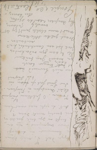 Curator: Here, in the Rijksmuseum, we have a work by George Hendrik Breitner titled "Annotaties," made circa 1900-1901. It’s an ink drawing on paper. Editor: My initial impression is of…intimacy, actually. It feels like sneaking a peek into the artist’s private thoughts. Raw and unfiltered, like a secret notebook. Curator: Indeed. It's essentially a page from Breitner’s notebook, filled with his own observations and thoughts. It serves almost as a cultural artifact in this way. Editor: What’s striking to me is the visible labour and effort put in for documentation: the text lists museum acquisitions and street scenes in a way that attempts to categorize Breitner’s subjects in his local area, but it seems he cannot quite wrestle to terms to fit into the neat container of his written description. Curator: The style certainly hints at the artist grappling with ideas. Note the free-flowing script and the annotations themselves. The words form lines but blur the line between capturing what is real, what is staged, what is performed for him in daily encounters. The repeated mentioning of artworks points to the ongoing inspiration that Breitner gleamed from museum spaces. Editor: Looking at this list now, the themes are really beginning to solidify. We get women's street style and clothing descriptions next to notes about public life and museum holdings, with Breitner really becoming a kind of archivist himself, carefully putting himself into his social context. Curator: Consider, also, the period it was created. The turn of the century was a time of great social change and uncertainty. Artists like Breitner were grappling with these shifts. This notepad showcases the influence and anxiety associated with art and society changing hands between social classes at the time. Editor: That's a critical point. Seeing his annotations about "Women in costumes" suggests his curiosity towards performative street behaviours, but in this context, the artist attempts to create some order to social disarray, though I do not feel particularly sympathetic to it. Curator: Well, regardless of your feelings toward his observations, the beauty here is precisely the opposite of order—it's the spontaneity, isn’t it? The stream-of-consciousness documentation of thought on a page is how Breitner has secured cultural continuity through memory, despite its personal subjectivity. Editor: Ultimately, a fascinating snapshot of an artist's mind at work and how artistic anxiety becomes a mode for documentation in its own right.