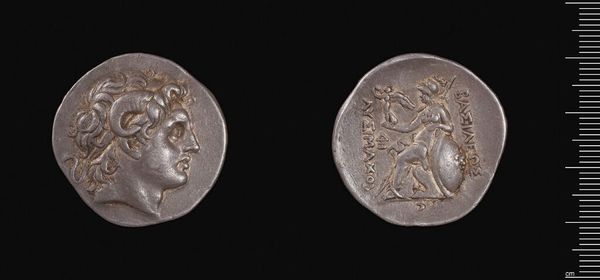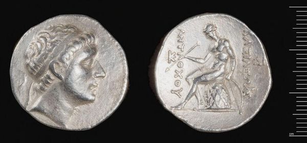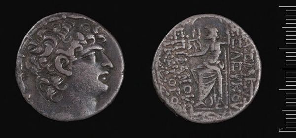 Curator: This is a tetradrachm, a silver coin, of Antiochos III the Great of Syria. It's amazing to hold something so old, isn’t it? Editor: It is! It gives me this strange sense of melancholy, like staring into a very, very old mirror, if that makes any sense. Curator: Absolutely! On one side, we see the portrait of Antiochos himself, with his regal diadem. The other side depicts a seated Apollo, god of music and light. Editor: The choice of Apollo is fascinating, almost like a soft-power PR campaign. Invoking cultural ideals, projecting an image of enlightenment and order... Curator: Indeed. It speaks to the deliberate construction of an image. You know, every time I look at it, I imagine all the hands this coin has passed through. Editor: And the empires it has witnessed! This little coin really encapsulates the intersection of power, representation, and the enduring human need for legacy. Curator: A pocket-sized piece of history, indeed.