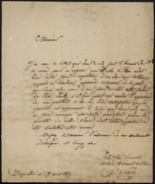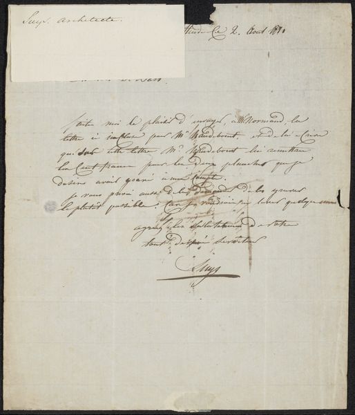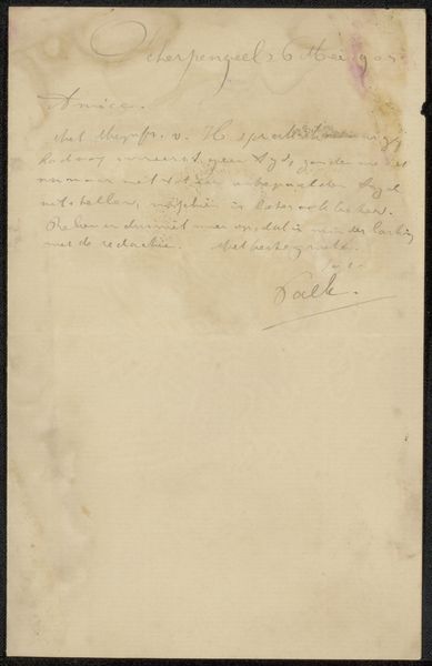 Curator: Good morning! I’m excited to discuss this intriguing piece by Jan Veth. Editor: Thanks! This is "Brief aan Etha Fles," possibly from 1901. It's ink on paper, so a drawing, but it looks more like handwriting—really beautiful calligraphy. It's clearly a letter, but the huge lines drawn through it make it appear cancelled, discarded. What do you see in this work? Curator: The lines certainly complicate our understanding. Were these added by the artist? By the recipient? And what did it mean to share that cancellation so publicly, so many years later? What was it that Veth felt wasn't appropriate? What cultural values are visible through these visual disruptions, I wonder? Is this letter meant to be read? Can it? Editor: Maybe not, I can’t make out any words in modern Dutch. Curator: I think the point isn't what the words said, but who he was. Jan Veth, a prominent figure in the Dutch art world. But who was Etha Fles to him? Do you notice it is addressed to a woman? I am curious to consider its gender dynamics of communication and control from Veth’s position. Editor: So the cancellation itself becomes a statement? That’s so interesting; I initially focused on the aesthetic quality of the handwriting itself. Curator: Precisely. These layers of intervention can also provoke some difficult questions around how we preserve such traces of power today and how context plays such a crucial role in appreciating artistic expression. Editor: I hadn't considered the complexities of displaying a "cancelled" message! That's made me see it in a completely new way. Curator: Absolutely. Thinking through all these considerations has brought into relief aspects of its gender and socio-political meaning.