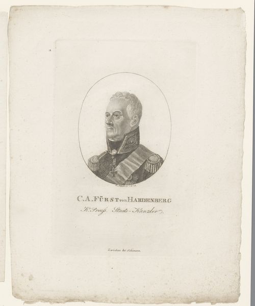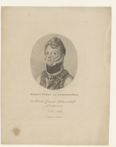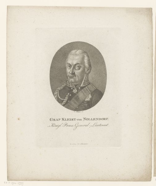 Curator: Looking at this engraving, titled "Portret van Ferdinand von Schill," made sometime between 1804 and 1843 by Friedrich August Brückner, what immediately strikes you? Editor: There's a sternness to it, wouldn’t you say? It is clean, and formal in its depiction, but somehow quite melancholy. I'm drawn to the texture, the way the engraving creates form. Curator: I find it illuminating to understand Schill as a figure of Prussian resistance against Napoleonic occupation. It offers insight into post-revolutionary power structures, and the identity of the military in the shifting dynamics of Europe. This is not simply a portrait; it’s a statement about nationalism and resistance in the wake of revolution. Editor: Absolutely. Think of the physical labor—the cutting of lines into the plate, the controlled application of acid, the repetitive action of the printing press. Each pull would carry Schill's image. Curator: Indeed, and how it then disseminates that ideology! Engravings like this were often reproduced, offering ways to engage and to reify that resistance in an increasingly literate public. It helped to bolster resistance movements by presenting him almost as an icon. Editor: And it's not just ideology. The paper itself—where did it come from? How was it processed? Was it linen? Was it wood pulp? The inks, too. This image carries the marks of many hands beyond Bruckner's. Curator: Absolutely! So, in a way, the material provides context for its existence—an insight that intersects beautifully with the themes of its depiction. This brings to the surface layers of meaning within the portrait of an icon that otherwise would be obscure to the everyday viewer. Editor: Yes, seeing beyond the representational to understand production reveals the dense web of historical forces involved. It enriches my interpretation significantly, and draws me closer to the man himself.