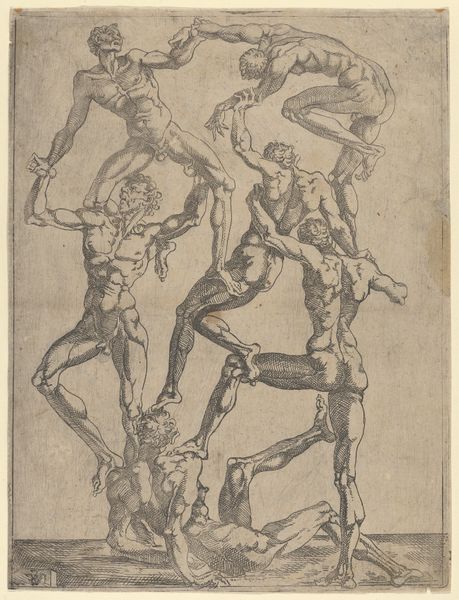 Curator: We are looking at "Two Nude Men Hitting Windmills, Standing on Their Heads, or Similar," an ink drawing by Nicolai Abildgaard. It’s believed to have been created between 1743 and 1809. What's your initial response to it? Editor: It’s a flurry of activity, a dynamic interplay of figures captured with swift, assured strokes. The earth tones of the ink lend a sense of grounding, even as the figures defy gravity. There's a palpable sense of physical exertion; they seem caught mid-motion. Curator: Abildgaard’s mastery is evident in the dynamism conveyed through the economy of line. Note the composition. He uses line weight to describe not only the forms but also light and shadow. How does the artist draw attention to key narrative elements and establish the intended spatial relationships in this medium? Editor: Exactly. The limited palette underscores the sheer physicality of the act depicted. One has to imagine the artist at work: rapidly applying the ink to capture this scene in life and conveying the labor it took to create art while celebrating other forms of work through the figures, though what their labor entails precisely is hard to decipher. It raises an interesting question about what it meant to represent such "low" physical exertion at the time. Curator: One might consider how the figures interact with the surrounding space—they appear suspended and ungrounded. I am drawn to the interplay between the positive space defined by the bodies and the surrounding negative space and how it creates tension. We have figures whose actions, to quote the artwork title, defy any conventional, intelligible goal. Is that defiance meaningful? Editor: Perhaps this lack of an identifiable purpose makes a commentary. In emphasizing physical movement and effort, is Abildgaard challenging conventional representations of labor? How much art and life share the common necessity to simply sustain themselves by means that, to outside observation, seem quite odd? Curator: It’s this capacity of drawing to articulate complexity with such minimal means that compels. Abildgaard truly explores the medium. Editor: The materiality here suggests much broader connections with the everyday manual work that most artistic representation has historically sought to exclude. A subtle inversion and subversion, indeed.