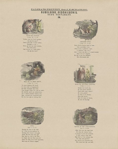 Editor: So, this is "Ziet! Kaïn, met geheven knods" by Albertus Willem Sijthoff, created sometime between 1861 and 1929. It's a woodcut print, and it’s… well, it’s quite a lot to take in! All these little scenes, almost like a comic strip, but with religious imagery. What do you see in this piece? Curator: What I see is a reflection of how religious narratives were disseminated and consumed within a specific social context. This print, produced for children, highlights the institutional role of religion in shaping moral values. Consider the impact of visual culture on young minds and the political implications of framing biblical stories in this way. Does it strike you as propaganda? Editor: Propaganda? I hadn't really thought of it that way. I was just focused on the storytelling aspect. But I guess choosing certain scenes, framing Cain in a certain light... it does shape a particular message, right? Curator: Precisely. Sijthoff, as a publisher, was participating in a larger cultural project, deciding which stories to tell and how to tell them. It is not just an innocent illustration but part of a broader didactic effort that served particular societal purposes. Who had access to such prints, and how might these images have shaped children’s understandings of morality and social order? Editor: That makes me see it differently. I was focusing on the images themselves, but you’re making me think about who made it, who it was for, and why. It's fascinating how much a seemingly simple children's print can tell us about the society it came from. Curator: Indeed. Art serves as a window into history. Reflecting on this, what stands out most now, considering our discussion on its broader cultural implications? Editor: Now, I think it is like holding a time capsule from a past social structure that sought to use religious storytelling to educate kids! Thank you!