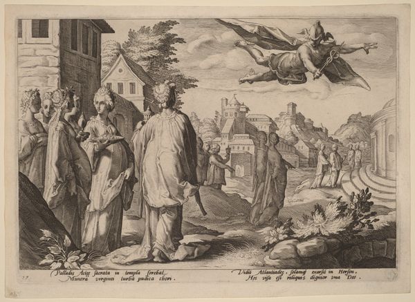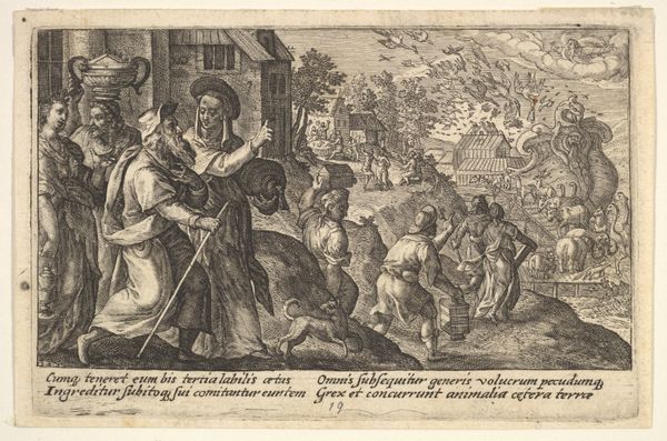 This is Jan van Londerseel’s engraving, "Inscheping van de ark van Noach". Executed around the turn of the 17th century, it presents a world teeming with ordered chaos. The composition is structured around a procession of figures and animals moving towards the ark. The eye is led from the intricate foreground figures to the meticulously rendered ark in the background, a structured vessel amidst the organic disorder. There's a clear demarcation between the human and animal figures which are portrayed with remarkable detail and texture. This contrast evokes a world on the brink, highlighting themes of salvation and order amidst potential chaos. The visual elements work semiotically, presenting a world in need of cleansing, an implicit critique perhaps of societal excess. Londerseel uses the biblical narrative to explore contemporary themes of order, control, and humanity's relationship with the natural world. The highly structured composition thus challenges the very chaos it depicts, suggesting the imposition of divine order on the world.