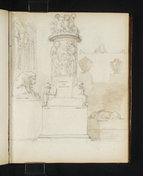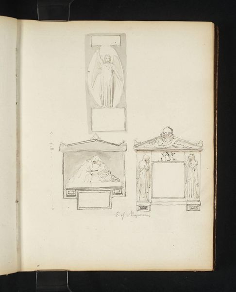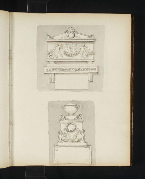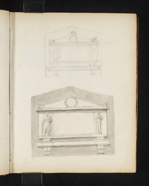 Editor: This sketch by John Flaxman, held in the Tate Collections, depicts what appears to be a classical monument. It's so delicate, almost ethereal. What strikes you most about its composition? Curator: Notice the symmetrical arrangement of figures flanking the central, circular motif. Observe, too, the architectonic structure—the careful delineation of planes and volumes. Do you perceive a tension between the linear precision and the suggestive incompleteness of the sketch? Editor: I see what you mean! It feels like a study in form and balance, more than a finished piece. Curator: Precisely. The essence lies in the interplay of lines and the implied solidity of the monument itself. It distills the classical ideal to its barest structural components. Editor: I appreciate how you've helped me see the structure as the message. Curator: And I, your fresh perspective.