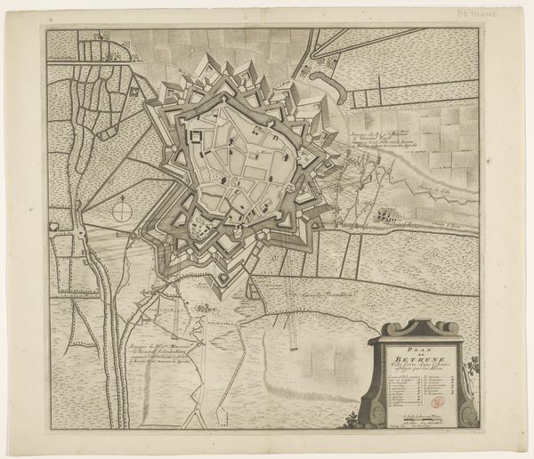 Curator: My first thought is…wow, claustrophobia! The detail is incredible, but so dense, it feels like the whole city is holding its breath. Editor: And, quite literally, being held. What we're seeing is "The Siege of Ostend, 1601-1602" by Baptista van Doetechum, an engraving rendered in ink. The bird's eye perspective presents Ostend encircled, suffocated almost. You really get a sense of how planned and controlled war was becoming at that time. Curator: Suffocated is definitely the word. All those rigid little houses jammed together, like teeth in a skull. And the besieging forces with their perfect little formations... there's a clinical detachment that makes it extra chilling, as though this were less a messy human affair and more a very intricate…puzzle? Editor: It is fascinating how cartography and warfare become intertwined here. The city itself, the emblem representing identity, is being attacked. Even the choice of an aerial view symbolizes the colonizer’s aspiration of power over land. It makes me wonder, how do we read a cityscape differently after experiencing conflict? Curator: Good point. Looking closer, I find myself drawn to those tiny human figures sprinkled around the outskirts, as if caught in a spider's web. Almost as if to ask if it will affect their personal spaces. They're the human element amidst all this cold calculation, aren’t they? Do you feel that we become emotionally desensitized, perhaps because we are just viewing conflict from a far distance? Editor: Those little figures do become poignant against such mechanical organization. But also, their gestures represent the collective spirit—resistance or adaptation. A lot of people use these kinds of historical records to connect their emotions to broader social memories and reflect on the effects on later generations. It really speaks volumes on what a place signifies when people view places differently after facing adversity. Curator: Indeed! The level of detail and clarity in the image brings immediacy to mind. You put that historical experience right there in the front, offering the perspective of a shared story being recorded from that time period. Editor: A great reminder of the way conflicts influence identity. Next time you wander through a modern city, try viewing it through the layers of the past and its conflicts. You never know what new depths might be found within a place that's survived.