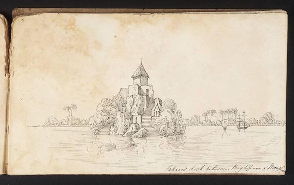 Curator: What strikes me immediately about this delicate drawing is the way the composition feels both solid and ethereal. Editor: Yes, there's a distinct charm to its faded tones! What we’re looking at is entitled, “Gezicht op de Zwanenburcht te Kleef vanuit het Kermisdahl," by Johannes Tavenraat, created in 1833. It's currently held at the Rijksmuseum. You know, it makes me think of those romantic-era travel journals…filled with light washes of watercolor over pencil. Curator: Precisely! And the subject, the Swan Castle in Cleves, immediately conjures myth and legend. Swans themselves are powerfully symbolic. In many cultures, they represent grace, beauty, love, and purity, yet they also carry darker connotations of transformation and hidden depths. It adds layers to a seemingly simple landscape. Editor: That's true. The swans, if they were there, are implied—ghosts in the water, so to speak. But the castle looming above… it does feel like a watchtower of stories. Notice how the village below seems nestled under its protection, a sense of continuity across time. Tavenraat wasn't just documenting; he was layering meaning, right? Curator: Absolutely. He’s connecting us to a visual history. This landscape speaks to cultural memory – the tales, beliefs, and collective imagination attached to specific places. It’s as if the artwork is whispering, “Remember…” Editor: I also love how it seems incomplete, almost like he was sitting there and capturing just that one moment, an attempt to hold it still. Perhaps Tavenraat was attempting to capture something personal. Curator: The visible pencil lines and washes remind us of the artist's hand and their immediate impression. We see the quick marks and erasures and almost step into his boots for a brief sojourn. Editor: In a way, it really captures what romanticism is to me: an attempt to see something of oneself reflected in a greater nature, but done with such tenderness, with so much grace. It's a tiny but beautiful, delicate world! Curator: Yes, it’s a visual echo of an older world seen through a deeply personal lens. A moment, captured and shared.