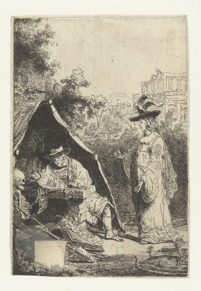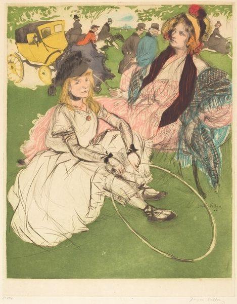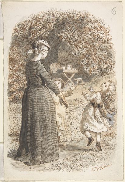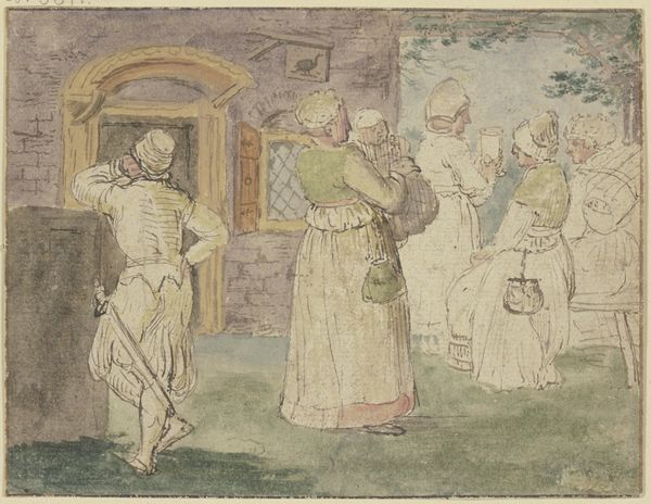 Curator: This illustration, by Arthur Rackham, seems to capture a rather morbid, yet captivating scene. Editor: Absolutely, there is something so playfully macabre about this composition; a curious blend of light and dark. The use of watercolors lends a soft, ethereal quality, doesn't it? Curator: Rackham employs ink and watercolour in this drawing, a rather popular combination in illustrative works to provide both detail and atmospheric wash. The title, "Reciting for their amusement all the epitaphs on the tombstones," hints at a specific social dynamic and perhaps comments on attitudes toward death in the culture. Editor: I am fascinated by how Rackham's visual language uses the landscape to frame the figures. Note the brick path, how it guides the viewer’s eye and organizes the space in the image; and the colour palette. The interplay between the sombre figures and the pastel hues adds another layer to the picture's tension. Curator: It raises interesting questions, though, about the consumption of grief as entertainment. How were such practices viewed, and what did they say about the social standing of those involved? We see these privileged ladies being entertained, while a man who perhaps earns money by the activity facilitates. What kind of cultural labour does that entail? Editor: I concur; this artwork is about power relations too, I imagine. Yet on a purely aesthetic level, I'm struck by the balance; the formal symmetry and the interplay between lines, the colours are striking without dominating each other... a beautiful structural piece! Curator: I think examining this artwork, we glimpse into past modes of social exchange surrounding death. We need to also examine who can speak for the dead and for what purposes? Editor: Exactly! Through your explanation of social conditions behind the image, I began to view the colour contrasts as a depiction of contrasting social classes that has altered my view. It is a richer viewing now!