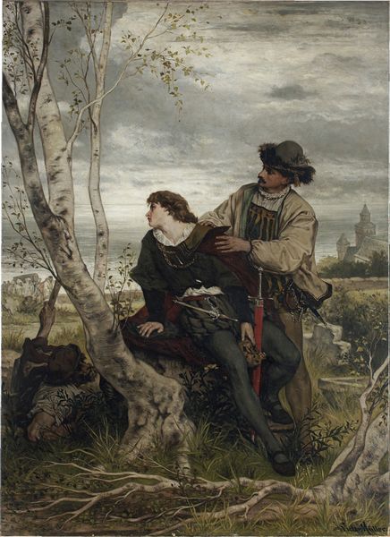 Editor: Here we have "The Parting of Robert Burns and Highland Mary," an oil painting by James Archer. It’s a really sweet scene, almost theatrical in its staging. What catches your eye when you look at this? Curator: I immediately consider the materiality of this painting. Notice the contrasting textures: the coarse wool of the shawls, her simple linen blouse, and his tailored coat. What do these materials tell us about their social positions, their access to resources? Editor: So, you’re thinking about what their clothes are made of, as markers of class? Curator: Exactly. Archer uses the tangible properties of these textiles to depict a divide. Look closer – how would the rough feel of the shawls compare to her bare feet on the ground? It adds to the sense of a harsh, unforgiving world outside their embrace. Are we to assume she is from a lower social stratum than he is? Editor: It seems likely. The red skirt, a kind of uniform... How was Archer thinking about clothing's role in expressing someone's position within society? Curator: That's a great question! This was painted at a time when notions of Scottish identity and folklore were being commodified and sold. So the materials Archer depicts—the tartans, the simple fabrics—become potent symbols within a developing national and economic narrative. Are they props, so to speak? Consider the labor involved in producing these materials. How does that inform our understanding of the work? Editor: It's interesting to think about that in terms of labor. Suddenly it’s not just a pretty picture; it's connected to a whole system of making and selling. Thank you! Curator: And thank you for pushing me to consider Archer's strategic use of these signifiers within the context of the art market.