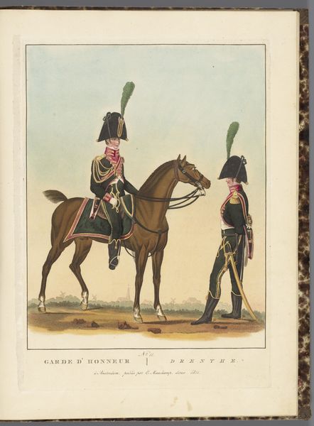 This is a print titled "Erewacht te Rotterdam," created in 1811 by an anonymous artist. It depicts honor guards in Rotterdam, their high hats adorned with plumes drawing our eye. Consider the plume. Throughout history, plumes have been potent symbols of power, virility, and status. In ancient Egypt, ostrich feathers signified Ma'at, the embodiment of truth and cosmic order. This symbolism, though transformed, echoes through time. Think of Renaissance portraits, where elaborate feathers adorned the hats of noblemen, signaling their elevated rank and martial prowess. Observe how in this print, the towering plume accentuates the guardsman's height, amplifying his presence and authority. The collective memory associated with plumes, from ancient deities to Renaissance elites, subtly reinforces the power dynamic. It is a visual echo, stirring subconscious associations with authority and prestige. This image taps into primal instincts, evoking feelings of respect, even awe. The plume, therefore, is not merely decoration but a charged symbol that resonates through the ages, adapted and reinterpreted, yet forever linked to our collective understanding of power.