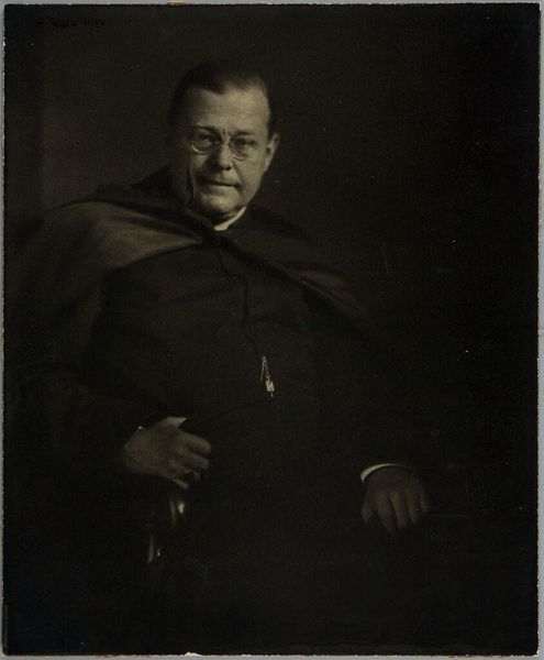 Curator: This silver print is a portrait of George Bartlett by John H. Garo. It measures about 42 by 35 centimeters and resides here at the Harvard Art Museums. Editor: He looks terribly distinguished! The fur, the monocle...there's a clear intent to project authority and importance. Curator: Garo was known for his portraits of Boston's elite. The soft focus and sepia tones were fashionable then, suggesting a certain artistic sensibility beyond mere documentation. Editor: Absolutely. The monocle is a powerful symbol; of learnedness, worldliness, even a detached, intellectual way of seeing. But beneath that, the eyes hint at vulnerability. Curator: Portraits like this reinforced social hierarchies. Garo was participating in a system where image-making contributed to the subject's status within his milieu. Editor: Indeed, the fur could suggest animalistic vigor! He wears that fur, and the man is clearly wearing the clothes, they are not wearing him. It speaks volumes about the cultural ideas of masculinity. Curator: It's fascinating how much these images reveal about the values of the time. Editor: It's also amazing how much of that symbolism persists in our own visual language today.