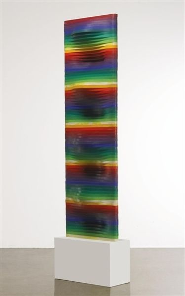 This sculpture by Fred Eversley, made with cast resin, shows us that art can come from anywhere, even industrial materials! I find it fascinating how Eversley takes this manufactured material and transforms it into something so visually intriguing, almost magical. The clear green resin encases a solid orange rectangle, creating a mesmerizing interplay of color and form. It makes me think about how we often separate art from everyday life, when really, they're so intertwined. The surface is smooth and polished, inviting you to reach out and touch it, but it's the way the light plays through the resin that really captivates me. It reminds me a little of the light works of Dan Flavin, but there's something unique in the way Eversley uses resin to create this sense of depth and luminosity. It really makes you consider how an artist's choice of material has the power to completely change the way we understand a work.