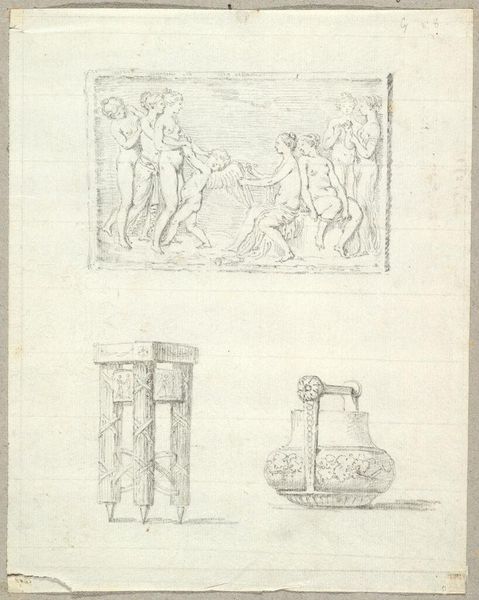 Curator: This print by Jean-Claude Richard, Abbé de Saint-Non, showcases a variety of antiquities, rendered with a delicate touch. It's a fascinating record of classical art and artifacts. Editor: Immediately, I'm struck by the juxtaposition of Egyptian and Greco-Roman symbols; it feels like a meditation on the mingling of cultures. What was the role of comedy here? Curator: The inclusion of the theatrical mask and pastoral scene hints at the influence of theater and rural life on ancient societies. The artist is presenting a wide range of historical and cultural references. Editor: Absolutely, the mask connects to emotional release and societal critique, whereas the vases invoke ritual and daily life. Look at how those vases use iconography to represent cultural identity! Curator: I agree, and this piece invites a reflection on how we assign value to objects from the past. What stories do they tell us about power, religion, and representation? Editor: It's a reminder that objects carry the emotional weight of civilizations, from grand narratives to intimate human experiences. These objects offer lasting symbols of our collective past.