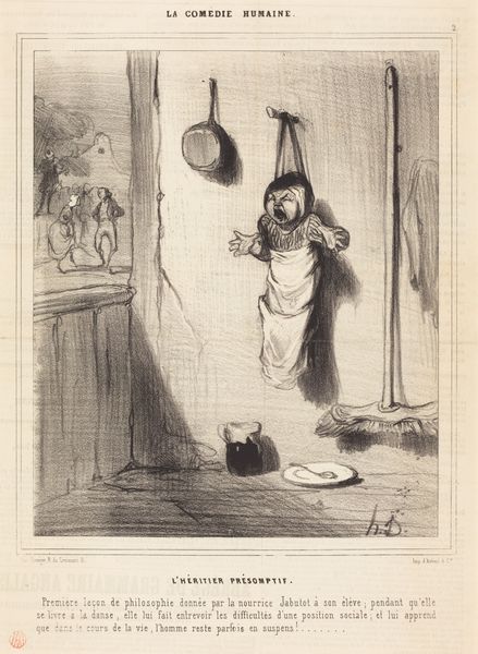 Curator: This is Honoré Daumier’s lithograph, “La mère dans le feu de la composition, l'enfant est dans l'eau de la baignoire!”, made in 1844. It's pretty striking, isn’t it? Editor: It is. There’s chaos in this domestic scene, emphasized by the strong contrast of dark lithographic lines and the seemingly frantic energy of the mother absorbed in her writing while her child is stuck in a tub! What can we read into this piece? Curator: Let's think about the labor embedded in this image. The title translates to "The mother in the fire of composition, the child in the bathwater!" What labour does that invoke? Editor: Well, immediately, the intense labour of being a mother... And a writer, maybe? It speaks to the difficulty of balancing intellectual work and domestic duties, both demanding immense effort and time. Curator: Exactly. The means of production here – lithography – allows Daumier to mass-produce and distribute this image widely. The crumpled papers strewn on the floor aren't accidental. They signal a struggle with creative labour. It implicates an early understanding of commodity culture through art as we look into labour conditions of this moment. What might this accessibility tell us? Editor: It seems he's commenting on the pressures placed on women during this period. Romanticism focused on emotionality. Were women encouraged or allowed to develop themselves, beyond their duties? Curator: It speaks to the tensions within romantic ideals when confronted with the material realities of life. Art is not made in a vacuum! The labor and tools required point us to social inequalities and production costs. Do you agree? Editor: Definitely. It is a commentary on art production! Considering that women still battle to find balance, I believe that his analysis stands true even today. Curator: Absolutely. It speaks to lasting societal and economical challenges for women, particularly working mothers.