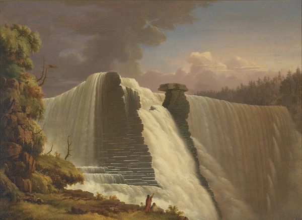 Albert Bierstadt’s oil on canvas, “Falls of Niagara from Below”, presents a scene dominated by cascading water and rugged rock formations. The composition is structured around a contrast between the dynamic, fluid forms of the waterfall and the solid, angular shapes of the rocks in the foreground. Bierstadt uses a dramatic play of light and shadow to enhance this contrast, drawing the eye from the dark, ominous sky to the brilliantly lit, churning water. The texture of the paint itself, thick and expressive in the rocks and more delicate in the mist, contributes to the overall effect. This formal arrangement isn't just aesthetic; it reflects a Romantic sensibility, evoking the sublime power and grandeur of nature. The painting offers a discourse on the relationship between humanity and the natural world. In his work, the romanticized view of nature is a site of ongoing interpretation, influenced by both the aesthetic and cultural contexts of the time.