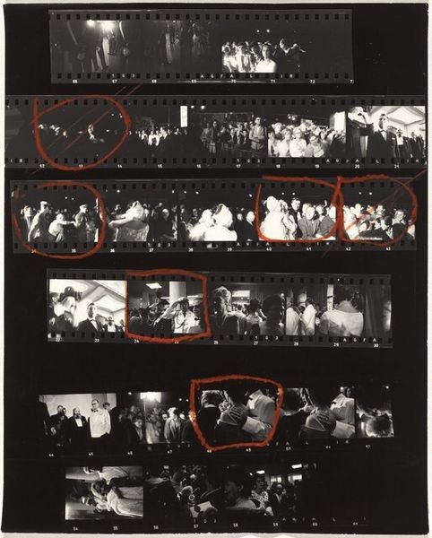 Curator: Robert Frank's gelatin silver print, “Guggenheim 651—San Francisco,” likely taken around 1956, presents a fascinating contact sheet brimming with urban narratives. Editor: Whoa, that’s a lot of stories crammed into one image! It’s got this vintage, gritty vibe—makes me think of smoky cafes and late-night jazz. What is your reading of it? Curator: Beyond the immediate aesthetic appeal, I view it as a poignant social document. Frank captured slices of San Francisco life that reflect post-war American culture. Consider the juxtaposition of apparent affluence in the upper rows against what appears to be more commonplace scenarios further down the contact sheet. Editor: Ah, good catch. I’m just now registering those top rows, it seems almost like a parade, filled with well-dressed folks. Further down there's a young lady at a table, looking almost wistful... It's like tiny plays happening next to each other, but they feel connected by something… nostalgia maybe? Curator: Precisely. And the work encourages dialogue on the photographer's subjectivity. His choice to include specific frames highlights a clear curatorial perspective, guiding us to focus on themes of class, performance, and societal roles prevalent at the time. Note also the slightly blurred and tilted composition that hints at Frank’s break from traditional photography. Editor: Absolutely, it does have a feeling of him wandering and capturing snippets on the run. And he has framed select strips! What I am drawn to, though, is that even though they're all separate moments, you start inventing this larger, overarching narrative, especially in monochrome. This photograph really puts a hold on the spirit of its moment. Curator: It does. Robert Frank offered through images a glimpse into American social fabric in an unadorned way, a look at real lives in flux, and this piece provides snapshots to interpret the zeitgeist through various levels of daily human activity. Editor: So, this feels like walking through a city of memories, trying to find common ground within seemingly scattered realities. Thanks to Frank for composing this poem.
