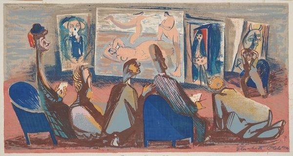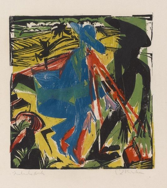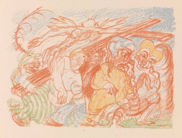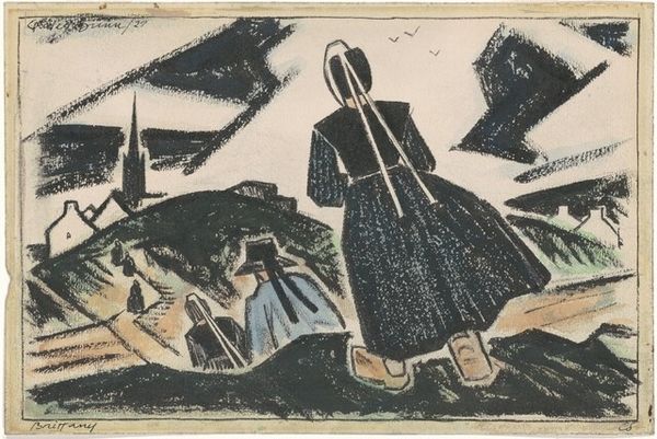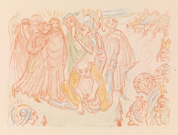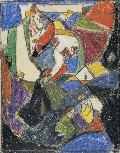 Adolf Hölzel made this drawing, Drei Figuren in Landschaft, with coloured pencils sometime in his life. What's striking is how Hölzel builds up the image with layers of colored marks, letting the texture of the paper peek through. It's like he's thinking through the process, making visible the journey of the artwork's creation. There's something really compelling about the materiality here. The colors are muted yet vibrant, and the surface has this tactile quality that invites you in. Look at the lower figure, how the blues and greens blend and separate, creating a sense of depth and movement. It's these little moments that make the piece come alive. Hölzel was part of this moment in German art, I am reminded of folks like Kirchner and Heckel, where artists were trying to find new ways of seeing and representing the world. This piece feels like an experiment, an attempt to capture something fleeting and intangible. It's about the process as much as the final image, and that's what makes it so fascinating.