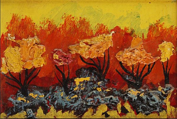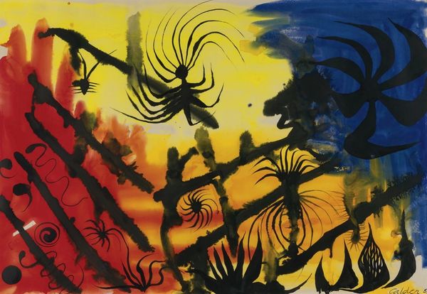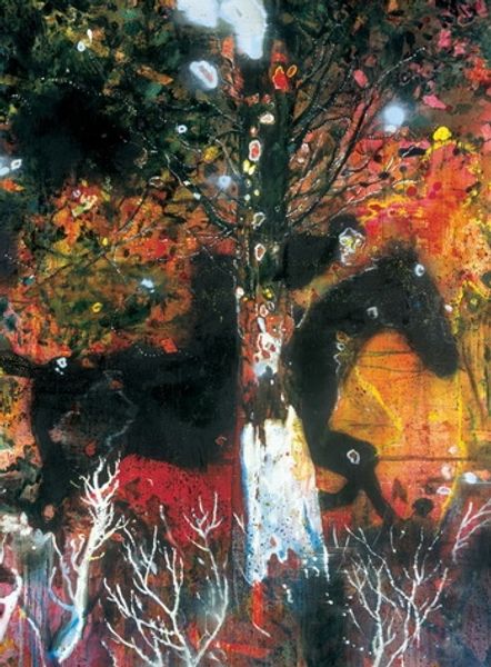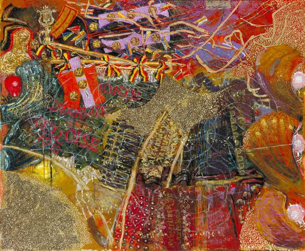 Curator: We are looking at Charles Blackman’s *Autumn Garden No. 3*, an acrylic on canvas work. Editor: Well, I’m immediately struck by the rather unsettling juxtaposition of the figure in red against the enveloping, autumnal hues. It feels both inviting and slightly claustrophobic, like entering a space of complex and possibly conflicting narratives. Curator: The use of acrylic allows Blackman to achieve a layered, almost textural effect, which contributes to the dreamlike quality of the piece. Notice the careful construction of the pictorial space, where elements of figuration, the figure and the dog, meet abstraction. The composition invites contemplation on the boundaries of the familiar. Editor: For me, it's interesting to consider what 'autumn garden' means as a space. Is it private? Is it manicured? Looking at Blackman's mark-making and colour choices, this work gestures toward notions of seasonal labour – collecting, shedding, the cultivation of a landscape… these things would require specific skills and hands. Curator: True, and one could interpret the symbolism through a psychoanalytic lens – the staircase, the hidden face… they create an allegorical staging of inner worlds. The whiteness of the dog adds an interesting formal contrast to the dark ground and red-clad figure. The relationships between these objects create the semantic complexity of the piece. Editor: Indeed. Also, if we read those stairs as being "steps" toward something, then that invites questions about access, who and what is excluded. And if we consider that the materials and labor came from somewhere, then questions emerge surrounding class, privilege and hierarchies that determine the availability of "autumn gardens." Curator: Your point emphasizes how form gives rise to critical discourses concerning both historical and contemporary contexts. For me, the expressive nature of this canvas comes primarily from Blackman's arrangement of contrasting pictorial components, allowing the viewer to find their own associations through symbolic interpretation. Editor: Agreed, but in bringing the idea of a ‘garden’ into focus, one cannot elude material conditions related to production and consumption; hopefully prompting viewers to critically reflect on how resources like this ‘garden’ are accessed and by whom. Curator: A compelling argument that contextualizes aesthetics within wider socioeconomic frameworks. Thank you for helping me to broaden the interpretation of this piece. Editor: Thank you! Thinking about what shapes how these things materialize is always something to reflect on.