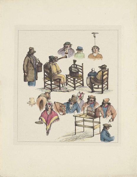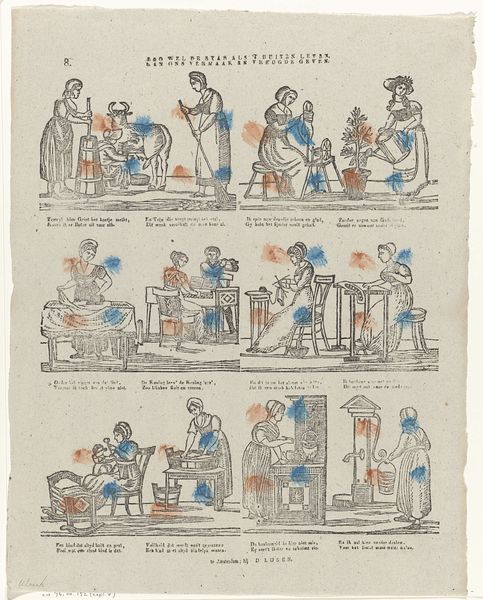 Curator: This charming watercolor illustration, which we believe Pieter Roosing created sometime between 1814 and 1839, offers a glimpse into "Female Occupations," as the title translates. Quite the array of domestic industry on display, isn't it? Editor: An array indeed! It’s immediately striking how… segmented it feels. Almost like a catalogue of perfectly posed moments rather than a cohesive scene. It brings to mind, say, a quaint sampler, diligently stitched with scenes of an ideal domesticity. Curator: Yes, that’s precisely it. Roosing isolates these vignettes of feminine roles—we see women ironing, gardening, caring for infants… The piece could almost function as a social document of its time, cataloging expectations for women. The composition organizes into rows and columns, an aesthetic I suppose reminiscent of, in retrospect, medieval illuminated manuscripts! Editor: The watercolor lends a delicate, almost ethereal quality that feels somewhat at odds with the pragmatic nature of the tasks depicted. I'm compelled by that dissonance between medium and message. A bit like filtering harsh realities through a rosy lens, perhaps? Curator: Absolutely. The soft colors and delicate lines elevate these mundane activities to something almost idyllic, stripping off the literal drudgery and letting us savor a slice of the time with a bit of nostalgia or admiration, wouldn't you say? And beyond the sheer documentation of tasks, look at the attention to details— the subtle shifts in dress, the array of implements! It adds to the richness. Editor: True. This isn’t just a painting about what women *did*, but about how those actions fit into a wider framework of social performance. The placement of bodies, the careful arrangement of space – it speaks to systems of labor and domesticity carefully, consciously considered. It prompts one to examine the nuances of the female experience in 19th-century society, wouldn't you say? Curator: Most certainly. And it does so in this charming way, full of tender light. An unusual picture that stays with you. Editor: Precisely. One leaves pondering not just images on paper but also one's notions around "Female Occupations," so artfully observed.
