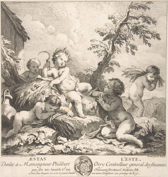 Editor: Here we have "Fall," an etching by Charles-Joseph Natoire, created sometime between 1730 and 1760. There's something almost playful about the cherubic figures and the frolicking goat; it's a very lighthearted depiction. How do you interpret this work, beyond the obvious seasonal connection? Curator: Playful indeed! To me, this etching whispers of lavish garden parties and the powdered-wigged aristocracy. Natoire, a master of the Rococo, was all about elegance and grace, even when representing something as straightforward as "Fall". This isn’t just any autumn; it's autumn as perceived through a very particular, privileged lens. I wonder, do you notice the almost decadent abundance suggested by the overflowing basket of grapes? Editor: I do now that you point it out! It does feel a little over-the-top. Almost as if the putti are drunk on life, or, well, grapes. Is it typical to portray autumn this way? Curator: Well, allegories were incredibly popular, a visual shorthand. The putti are stand-ins, personifying the abundance and joyful harvest time. What strikes me is Natoire’s deft use of line. Notice how light and airy the composition feels despite the density of detail. The etching brings such precision! Do you think this technique reflects the Rococo's embrace of ornamentation? Editor: That makes sense. It's ornate, yes, but it’s also somehow delicate. It's funny; when I first looked at it, I just saw chubby babies, but now it seems more clever, more constructed. Curator: Precisely! And isn't that the joy of spending time with art? We come with our own perspectives, and slowly, layer by layer, we discover the intentions and stories held within. It teaches us to savor our experiences. Editor: Definitely! I'll never look at an etching, or a chubby cherub, the same way again!