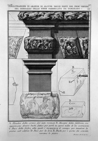 Editor: Here we have Giovanni Battista Piranesi’s "Demonstration of cross-section diameter of the Gate of the Temple of Vesta in Tivoli," a print, and drawing. The level of detail is incredible! I'm struck by how Piranesi merges meticulous architectural rendering with almost romantic depictions of ruins. As a historian, what elements in this drawing grab your attention? Curator: The tension you identify between precise architectural documentation and a romantic sensibility is key. Consider Piranesi's project in its time. He was creating these prints during a period when European elites were increasingly interested in classical antiquity. Piranesi's work didn’t just depict Roman structures, it participated in constructing an idea of Rome—one that served specific political and cultural agendas. Editor: So, these aren't just neutral records of ancient sites? Curator: Exactly. Look at the stark contrast between the meticulously rendered architectural details and the heavily shaded, almost chaotic, textures used to depict the ruined sections. What do you think that contrast communicates? Editor: It feels like the artist wants us to notice not only what *was*, but what *is* now and by consequence its change throughout the years.. almost emphasizing the effects of time and decay on these grand structures. Curator: Precisely. And what message might be conveyed by focusing on the ruins? Consider the political implications. Editor: Maybe it's about the transient nature of empires, the idea that even the greatest civilizations eventually decline? Perhaps as a subtle commentary on contemporary power structures? Curator: Exactly! Piranesi's prints fed a fascination with Roman grandeur, but also subtly questioned contemporary society through that historical lens. This print allows us to question the construction and consumption of history itself. I had never looked at this work with your vision. Thanks!