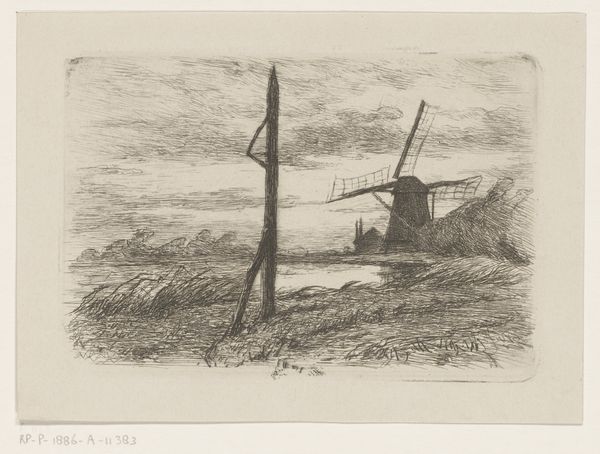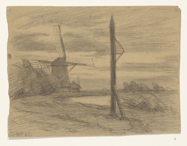 Curator: This drawing is by J.P. Møller, titled "En mølle. Parti på Volden i Kjøbenhavn," created in 1847. The medium is ink. Editor: What strikes me is the starkness, a near monochromatic simplicity, and those rapid, confident pen strokes! It evokes a sense of quiet melancholy, a stillness hanging over the landscape. Curator: I'm drawn to the evidence of its production. The use of ink, the visible layering of strokes - it speaks to the labor, the specific process through which the image comes into being. We can also examine its relationship to other ink drawings of the time and speculate about how materials were sourced and distributed. Editor: The windmill, of course, looms large, not merely as a structure but as a symbol of industry and human intervention in the natural world. Its silhouette dominates the skyline. Consider how windmills often represented prosperity but could also suggest the relentless, grinding passage of time. Curator: Precisely. And think about the social context! What was the function of windmills during the mid-19th century in Copenhagen? They were machines tied directly to labor, to the processing of grain. Was the artist perhaps considering issues around industrial development? Editor: Beyond its practical use, the windmill's persistent symbolism continues even now. It whispers of times gone by. And isn't there a certain romanticism present, viewing an element of the growing industrialized world presented almost as a quiet sentinel in the countryside? Curator: It's equally crucial to consider how such landscapes may have served different classes of consumers. Did this piece offer middle-class audiences, for example, access to rural imagery they may have been increasingly removed from? It asks who gets to look, and from what position. Editor: Yes, the cultural coding of landscape certainly tells of changing social structures, and landscape artworks certainly act as stages for expressing sentiments. We are all influenced by our visual landscape whether or not we reflect upon them. Curator: This work, viewed materially and socially, offers valuable information. I hadn't thought of its social function in such symbolic ways until now. Thank you. Editor: It's been wonderful seeing how you center the modes of production as an extension of its symbolic content! I'll continue to seek echoes in how historical contexts mirror our own preoccupations.