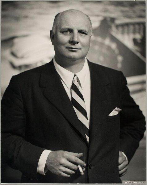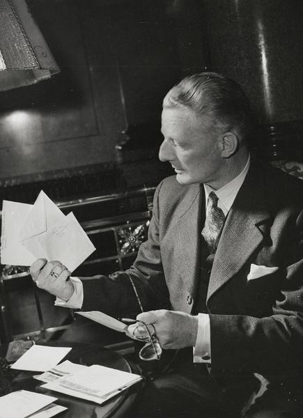 Curator: Before us, we have a gelatin-silver print identified as "Portret van Senator Robert Taft," possibly from 1950. Its photographic nature renders it distinct. Editor: The most striking thing to me is the granularity of the image; it suggests a very tactile engagement with materials in its making. You feel the presence of the photographer, of darkroom labour. Curator: Observe how the monochromatic palette simplifies the subject to a play of tonal values and texture. The sitter’s gaze meets ours directly, imbuing the photograph with presence. The careful modulation of light and shadow is central to the overall effect. Editor: The image speaks volumes about the means of production inherent to photography, which I would assume was printed by hand and then distributed on paper—materials often linked to accessibility. Curator: What are your thoughts about the formal attributes like the senator's placement within the composition? What do the eyeglasses signal? Editor: In many respects, they represent work! Taft isn’t relaxing at home, or we would hope not to assume this. We see the objects and attire required by those holding formal positions, thereby connecting Senator Taft to an established visual language surrounding governance. Curator: The background is nondescript, focusing our attention firmly on Taft’s face and the deliberate tilt of those spectacles held between his fingers, suspended in time. Editor: Knowing more of the context of labour might reveal the kind of economy Taft and his policies upheld or suppressed. One image cannot answer everything. Curator: Perhaps, but through close viewing we discover something compelling about the sitter, captured here, even now. Thank you for that analysis. Editor: Thank you; now I’m seeing the photograph and Senator Taft in an entirely fresh light, beyond just the initial surface impression.