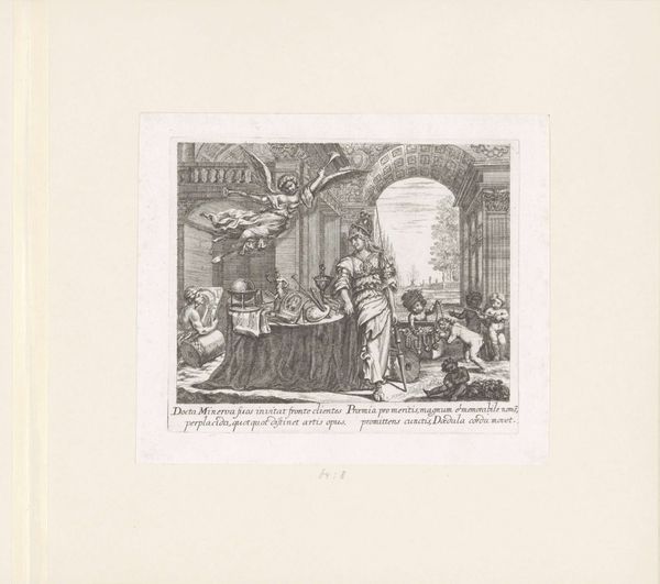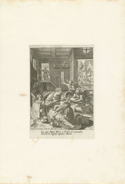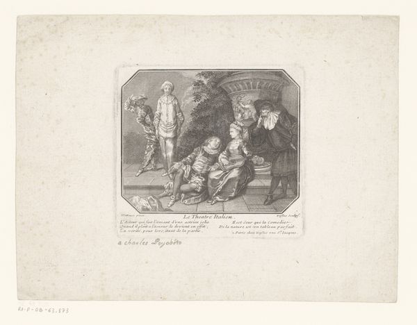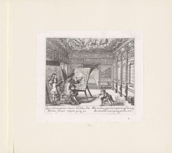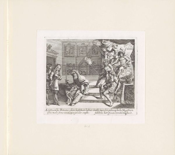 Curator: Ah, I'm drawn to the energy in this engraving, the collective buzz. It's titled "Schildersbent in een herberg", dating back to 1680. The Rijksmuseum holds this print, an engraving by Mathäus Küsel. Editor: Yes, the feeling is definitely…rambunctious! A rowdy party scene. Lots of people, quite tightly packed into the scene – and even a dog at the very front! The tonal variation gives the image this intense feeling of a crowded room. I imagine loud chatter and clinking glasses. Curator: Precisely. It's a depiction of the Schildersbent, or "Band of Painters," a society of primarily Dutch and Flemish artists working in Rome. These genre scenes provide key insights into artist social life during the Baroque era. Observe the contrast Küsel creates between the jovial, convivial group, with smoking, drinking, and toasting on one side, and the chaotic duo experimenting with… fire on the left! Editor: Yes! Like they're performing some alchemy experiment gone delightfully wrong, or maybe an attempt at a bit of dramatic lighting for…themselves? It is about painters, after all! I do think the experimentation motif goes beyond what we’re seeing enacted in front of the hearth: This engraving serves as a visual documentation of the social codes and playful spirit which define their artistic brotherhoods. Curator: Symbolically rich in depictions of brotherhood, patronage and artistic ego; a moment captured, engraved for a kind of immortality, don't you think? The scene is an active declaration of identity. This alludes to an interesting dance that occurs between representations of rebellion and establishment – or a collective desire for artistic elevation, as well as preservation of reputation. Editor: It's fascinating how a seemingly simple genre scene blossoms into a portrait of cultural dynamics. It has got so many stories within stories. Curator: Indeed. Such lively expressions within the constraints of the engraving, a perfect blend of chaos and camaraderie that speaks volumes about the social life within that moment. Editor: Yes. Each element seems strategically placed to showcase that boisterous gathering. It feels almost staged… in the best way, of course.