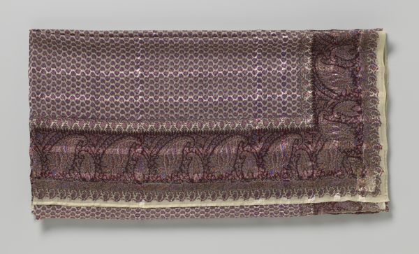 Curator: Looking at this "Shawl Fragment" from around the 19th century at the Minneapolis Institute of Art, what's your immediate sense? Editor: Worn edges, like whispers from the past, threads frayed by stories untold... I sense both delicacy and defiance in this wool textile. Curator: It's more than just old cloth, isn't it? We are looking at something representing patterns woven into the culture through weaving. Think of shawls—traditionally not just for warmth but signifiers of status, region, and rites of passage. This fragment suggests that once the design was significant. Editor: I imagine women, generations maybe, huddled together, each stitch a silent meditation, creating their patterned language… that central red band screams vitality! Curator: You feel that the red is about vitality, yes it would correspond to blood or life force in cultures and religions. The geometric flower and organic patterning speaks to design influences that stretch from east to west as well as pattern and decoration design influences. This fusion has become linked in historical contexts to notions of orientalism and the exotic. Editor: There is beauty in the attempt of a neat repetition… But even abstract beauty succumbs, and patterns decompose; seeing imperfection there feels vital in this well patterned structure. Curator: These geometric shapes almost play with the eye; some viewers feel that they see an 'op-art' visual effect in this shawl. However, this woven expression predates that movement; there is a longer history of humanity seeing this tension. The very way patterns are chosen or composed reveals culture or individual creativity—consider, after all, the complex psychology we apply when designing rooms. What meaning do we intend our designs to give out to others? Editor: Yes, this tiny wool relic is filled to bursting! I'm stuck wondering, whose story does this particular fragment now carry and what tale will we invent about them as the viewers? Curator: So well put! With art objects like these fragments, all we can be certain of is that visual expressions will outlive people’s memories but their symbolic legacy is constantly reworked to give us access.