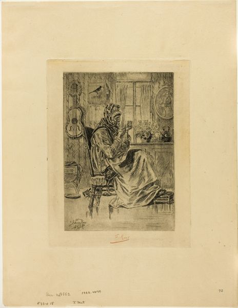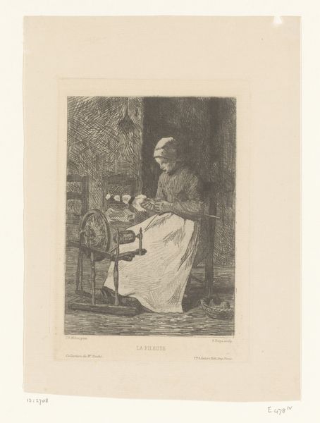 Curator: What a sharp scene! I'm immediately struck by the visual narrative—that intense corseting... one can almost feel the pressure! Editor: This engraving is titled "Progress of the Toilet, The Stays," created around 1810 by James Gillray. It resides here at the Rijksmuseum, a window into early 19th-century toilette practices rendered with a satirical twist. Curator: The emphasis on ritual here! Consider the woman at her vanity, mirrored by the small dog in the looking glass; then the maid’s grim assistance, all under the theatrical burgundy drapery. Gillray employs such stark caricature to mock what seems like extreme aristocratic vanity. Editor: Corsets in that era are potent symbols—signifiers of both repression and aspiration. They forced the body into an idealized shape, promising status but also enforcing societal constraints. Curator: Look closely; it isn't merely satire of personal vanity, but the politics of presentation in public life. Consider what "shape" meant in the period-- to be shaped to proper social expectation, class standing, and availability within social networks. Corsets perform this social demand through their rigid demand upon the figure. Editor: Indeed. The "toilet" was not simply about personal grooming; it was a social performance, particularly for women. These rituals cemented the complex relationship between private presentation and public perception, an aspiration that is almost always at conflict, a tension beautifully explored here. Curator: To see the tension captured so deftly within the frame reminds us of our ever-evolving visual language for the way that bodies are shaped into social performance. Editor: Gillray gives us so much more than simple portraiture; this is socio-political commentary. A poignant lens into societal expectations, made timeless through vivid representation.