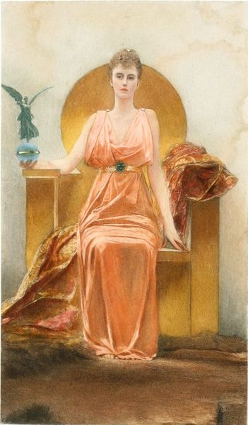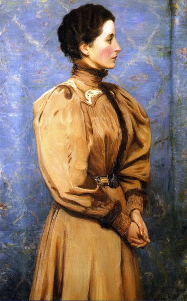 Editor: Here we have Théo van Rysselberghe’s "Portrait of Madame van Rysselberghe," painted in 1891. The optical mixing is so evident! The entire canvas vibrates. What compositional strategies is Rysselberghe employing? Curator: The divisionist technique immediately strikes the eye. Note the juxtaposition of complementary colors—blues and oranges—applied as discrete points. How does this interplay of hues affect the perceived form and texture of the subject’s dress? Editor: It almost feels as if the dress is illuminated from within, a sort of glowing presence. I can also note the patterning created on her dress with this unique brushwork! Curator: Precisely. Also consider how the artist manages to achieve tonal gradations despite the seemingly uniform application of dots. What semiotic potential can be extracted from this structural system? Is it simply optical, or does it attempt a form of psychological portraiture? Editor: I can't tell for sure, it's really impressive how distinct points merge so beautifully! Is there an effort to move beyond surface realism? Curator: Look at the structuring geometry within the work, particularly the subtle vertical and horizontal lines. Note how the subject’s figure, while seemingly naturally posed, fits almost perfectly into a constructed armature of spatial relations. Editor: The divisionism really comes into focus. I appreciate how this careful application creates such dynamism. Curator: Indeed. Reflecting on the relationship between visual theory and painterly execution reveals how art operates within structures, as both expression and sign. Editor: That really highlights how Van Rysselberghe achieves not only optical mixing, but a remarkable portrait using tiny strokes of color. Thank you for pointing this out to me!