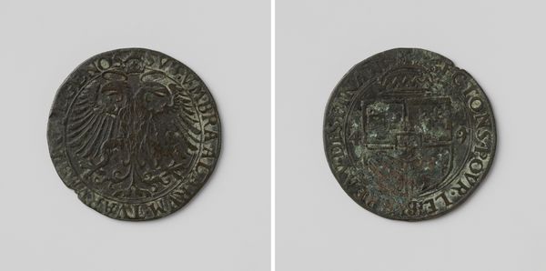 Curator: Looking at this coin, what resonates with you? Editor: Immediately, I see a humble artifact speaking of long-lost trade routes and daily exchanges. It makes me wonder, how many hands held this, and what did they buy with it? Curator: That's the allure, isn’t it? This is a Zutphense stuiver, a coin minted in 1605 in the city of Zutphen, part of the Dutch Republic during a period of great economic and artistic flowering. The material is humble: base metal, likely silver, and created by engraving. It carries more than monetary value, of course. Editor: Absolutely. Coins were such powerful communicators. What symbolic language is deployed on its faces? Curator: One side features the city's coat of arms, contained within a heraldic shield— a symbolic assertion of Zutphen’s civic identity and power. The reverse shows an image of Saint Walburga as seen in the Grote Kerk in Zutphen. She was seen as protector of the city, ensuring safety and fortune. It's fascinating to see the ways religious and civic powers intertwined in something as banal as currency. Editor: Given the fraught, emergent sense of national identity within the young Dutch Republic in 1605, it’s significant to see the coin bearing a message that links trade and religion so directly. That this coin probably circulated locally really amplifies how vital these icons of stability and safety must have been for people. Curator: Yes. Symbols build meaning around coinage like this, cementing not only financial exchange but shared values. The iconography presents this local, communal feeling. Editor: To hold this little coin would be like touching the aspirations and anxieties of everyday people in the Golden Age. Thank you. Curator: The pleasure is mine. I can't help but imagine it clicking in someone’s purse and think about how economics builds entire mythologies.