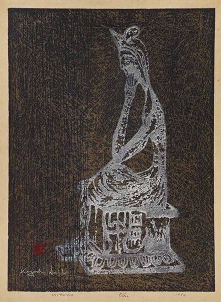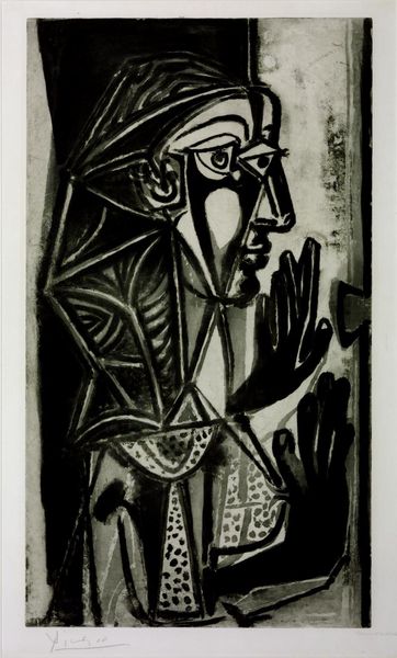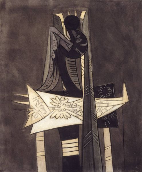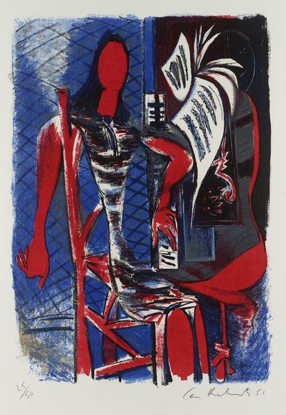 Vytautas Kasiulis created 'The Accordionist' using an unknown medium. The artwork draws you in with its bold use of color, particularly the striking contrast between the red trousers and the deep blue background. Kasiulis's expressive brushwork and distorted forms suggest an influence from Expressionism, a movement known for conveying emotion through abstraction. Observe how the musician's figure is elongated and somewhat disjointed, which adds to the emotional intensity. The accordion itself, with its vibrant mix of colors, stands out as a focal point. Semiotically, the instrument and the roses in the background might be cultural signs representing music and beauty, or perhaps deeper themes of life and transience. The painting doesn't aim for a literal representation but instead captures the essence of a moment, destabilizing traditional representational values. Consider how Kasiulis plays with the structure of the composition, drawing us to the underlying tension between form and feeling, which remains open to interpretation.
