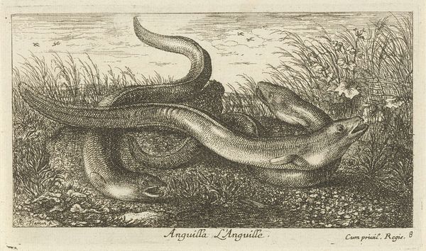 Albert Flamen created this artwork, "Gepen op het strand", as an etching, presenting us with a scene dominated by a pile of needlefish resting on a beach. The composition is strikingly divided between the still life of the fish in the foreground and the busy maritime activities in the background. The linear precision of the etching technique captures the texture of the fish and the subtle gradations of light across the scene. Flamen uses diagonal lines to create a sense of depth, drawing our eye from the detailed foreground to the distant horizon. The natural elements such as the shells and tufts of grass on the lower left, contrast with the commercial elements such as the boats and the figures bustling around tents on the right, suggesting a complex interplay between nature and human activity. Despite its representational style, the organization of elements invites us to consider the structured arrangement of the image and the cultural narratives embedded in this coastal scene. The sharp contrast and ordered composition function aesthetically and serve as a commentary on the relationship between natural resources, human industry, and artistic representation.