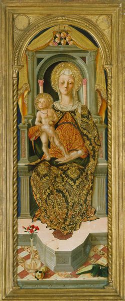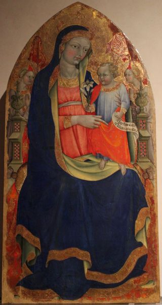 Gentile da Fabriano painted this fresco of the Madonna and Child with Angels in Orvieto Cathedral. The composition is elegantly structured, with the figures arranged in a harmonious balance within the arched frame. The fresco technique lends a textured surface, enriching the visual experience with a tactile quality. The use of colour and form plays a crucial role here. Observe how the Virgin’s cloak, rendered in deep blues and greens, contrasts with the golden hues surrounding her and the Child. This juxtaposition not only draws our eye to the central figures but also creates a symbolic interplay between the earthly and the divine. The interplay of the figures is further enhanced by the semiotic system, which engages with cultural codes of the time. The Madonna's serene expression and gentle posture embody the ideal of maternal love, reflecting the era’s values and beliefs. This work serves as a cultural artifact but as an exercise in visual language and ideological expression.