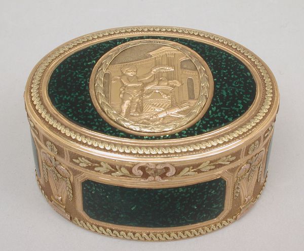 Curator: Let’s take a look at this remarkable snuffbox, crafted between 1776 and 1777, attributed to Pierre-François-Mathis de Beaulieu. It's currently held in the collection of the Metropolitan Museum of Art. Editor: Oh, the delicacy! It's like a miniature gilded cage. The gold relief is very refined, and the overall impact, I think, conveys the luxury and power that goes beyond pure utility. Curator: Indeed. Consider the interplay of materials. Gold, metal, and ivory were combined, requiring incredible precision in the sculpting, engraving and fitting of components. It speaks volumes about workshop practices in the late 18th century where specialisation was intense, yet craft guilds expected quality at every level of making. Editor: Precisely! Those cherubic figures rendered in gold on the lid! It suggests a revival of innocence and an echo of a distant Greco-Roman antiquity, reinterpreted for an elite audience that enjoyed symbolism within the decorative arts. Does it reflect an aristocratic yearning for simplicity or an engagement with the philosophy of enlightenment? Curator: Or a desire to show off power and good taste, let’s not forget. I see more of an expression of Rococo excess, albeit contained within a relatively small object. What quantity of precious materials went into something this scale? What was the labour involved in creating the woven or netted decoration visible in each of the panels, each line individually done? These items aren’t created in isolation but express and reify hierarchies in society and within artisanal networks. Editor: Possibly, but notice the overall form. An octagonal shape adorned with delicate garlands evokes sentiments and courtly love themes, contrasting the gridded ground. I perceive nostalgia, as if containing dreams, hinting at complex psychological states using a visual vocabulary inherited across centuries. These are items charged with emotion. Curator: A container for ground tobacco perhaps can contain multitudes. It shows an obsession with surfaces, the value of material things and expert execution that underpinned social relations, a cultural phenomenon as revealing now as it was then. Editor: Well said. It appears that in just a glance, our different lens on interpreting what can seem a simple snuffbox opens different pathways. Curator: That it does; I agree entirely. A glimpse into labour, and value.
