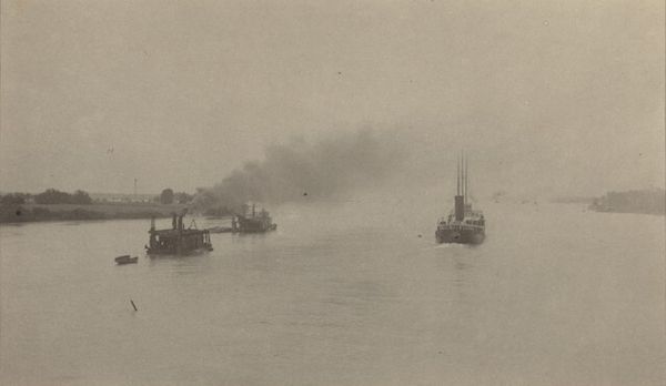This is Paul Güssfeldt's "Stoomschip op zee," a photograph capturing a steamship at sea. The composition immediately draws the eye to the steamship positioned centrally, yet the receding lines of the wake also pull our vision into the frame. The artist plays with depth and perspective. The tonal range, from the dark smoke billowing from the ship's stacks to the light foam of the waves, creates a structured contrast that defines the scene. The ship, a symbol of modernity and progress, is set against the natural backdrop of the sea and distant land. This juxtaposition invites reflection on humanity's relationship with nature. The photograph, while seemingly straightforward, employs a formal structure that reflects broader artistic and philosophical concerns of its time, inviting an ongoing re-evaluation of our place in the world.