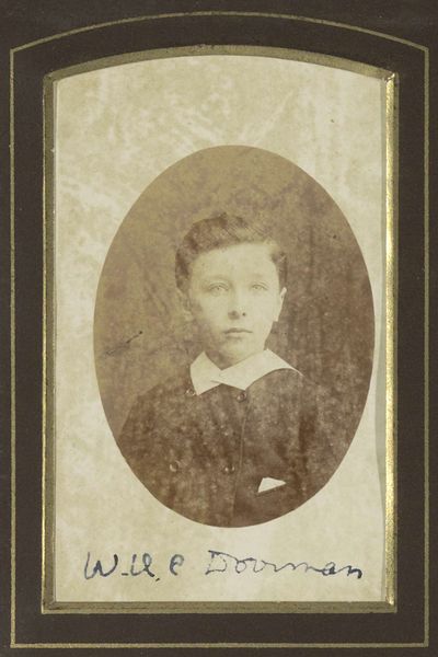 This is a studio portrait of a boy in a suit by Bernardus Bruining, dating back to the 19th century. Notice how the sepia tones cast a uniform light, enveloping the subject in a soft, almost dreamlike atmosphere. The oval frame isolates the boy, focusing our attention on his poised demeanor. The photographer employs a classic composition, emphasizing symmetry and balance. The lack of vibrant color directs us to the textures and forms. The boy's attire, formal and structured, contrasts with his youthful features, creating an intriguing tension. This formal presentation invites us to think about how identity is constructed through clothing and representation. The photograph can be seen as a cultural artifact, reflecting 19th-century ideals of representation and social status. The photograph's subdued palette and symmetrical arrangement invite contemplation on the relationship between representation, identity, and cultural expectations. It serves as a reminder of how even seemingly straightforward images can be interpreted through a lens of social and historical understanding.