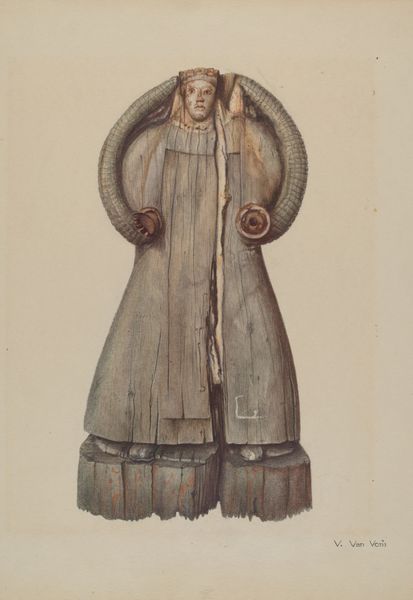 Curator: Let's turn our attention to "Bulto," a watercolor and colored pencil drawing from 1938, created by Carl O'Bergh. Editor: My initial impression is one of stillness and humility. The palette is muted, and the figure possesses a sense of quiet introspection. Curator: It’s interesting to note the folk-art elements in play here. The technique mirrors traditional methods for illustrating or planning how these types of figures are built and presented. Look at the depiction, for example. Editor: Yes, notice the carefully rendered hands, positioned almost as if offering something or perhaps beseeching the viewer. The iconography, simple as it appears, feels deeply rooted in some form of cultural tradition. The clothing, particularly the long tunic, conveys piety and perhaps a connection to monastic orders or similar. Curator: From a production standpoint, observe how the artist chose watercolor to mimic the textures we associate with carved wood. There is great skill in evoking three dimensions via the choice of layering colours on what is ultimately, a flat surface. We must consider that there are real connections to both sculptural folk-art and watercolor painting. Editor: The figure itself has a timeless quality. It reminds us of a collective memory of devotion, irrespective of particular belief systems. Its stillness invites a meditative experience, which allows us to ponder universal ideas regarding faith, mortality, and community. Curator: Precisely! The act of rendering it becomes part of this history. By bringing these traditional artistic elements into the frame of modern artistic styles of that time, it questions those conventions as it engages in new production methodologies. Editor: Ultimately, “Bulto” connects the personal with a powerful and moving symbolic representation that exists inside our consciousness. Curator: And perhaps we gain a bit of awareness by considering both its conceptual roots and the materials used to bring them to the fore.