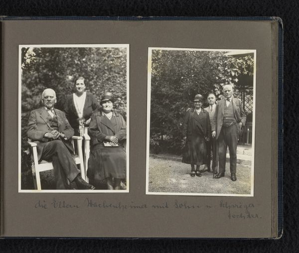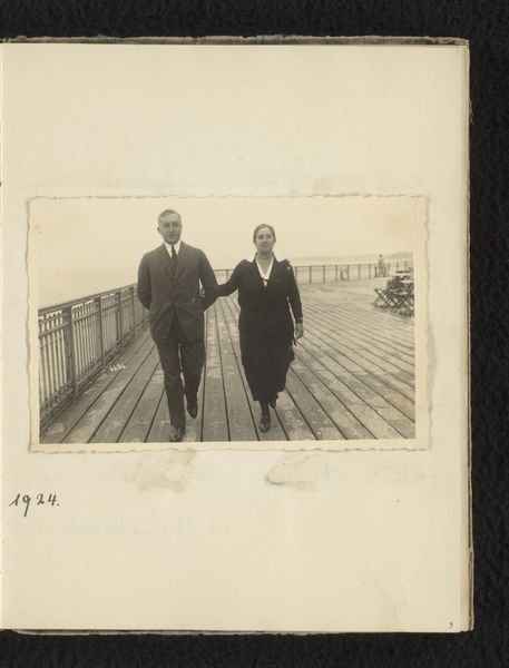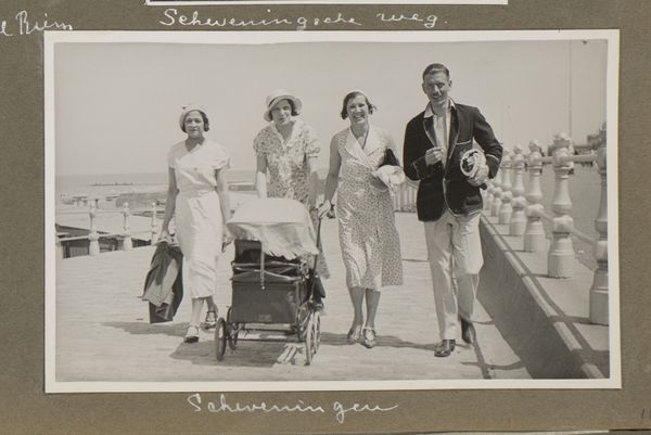 Editor: We are looking at Johannes Hendrik Misset’s photograph, “Henriëtte Wassink met Johannes, Dootje en Wilhelmina van Zijll de Jong op de pier van Scheveningen,” taken sometime between 1930 and 1935. It’s a black and white image of a group of four people strolling on a pier. It strikes me as both posed and candid, like a scene caught mid-action. What do you see in this photograph? Curator: I am drawn to the photograph's planar organization and rhythmic qualities. Notice how the parallel lines of the pier's wooden planks establish a strong sense of perspective, guiding the viewer's eye toward the horizon. Then observe the positioning of the figures - they aren’t evenly spaced, but create subtle, staggered verticals against this strong horizontal base. The repetition of circular shapes - the hats, the faces - creates a visual echo. What effect do these stylistic elements create, do you think? Editor: Well, the lines do create a sense of movement. It does feel like you’re walking *with* them down the pier. And now that you mention it, I see those circles creating balance in the image. Curator: Precisely. This photograph eschews traditional notions of capturing a singular, decisive moment. Instead, it emphasizes form, the manipulation of perspective, and the interplay of shapes to generate meaning. Even the muted tonal range adds to the overall mood. There isn’t sharp contrast or drama; it's quite subdued. Editor: I never would have picked up on those design components on my own! I’m accustomed to immediately trying to contextualize historical photos. Thank you! Curator: The visual grammar can tell us much on its own, even stripped of immediate historical understanding. It shapes our experience just as powerfully.