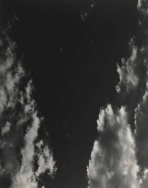 Curator: Looking at Alfred Stieglitz's black and white photograph "Songs of the Sky" from 1923, I'm struck by how elemental and moody it feels. What is your first reaction? Editor: A melancholic beauty. The tonal range, especially how the soft whites blend seamlessly into deep blacks, is arresting. It's a very balanced composition despite being so asymmetrically dominated by shadow. Curator: Stieglitz aimed, in part, to evoke the subjective experience, freeing photography from mere objective representation. Think about his efforts promoting photography as fine art. Editor: Indeed. We're far from a literal depiction. He captures the emotional resonance of nature rather than a specific cloud formation. Curator: Stieglitz famously spoke of these photographs as being equivalent to his own feelings. That his social and artistic circles elevated subjective interpretation tells a lot about his place in shaping art appreciation in the US. Editor: Certainly, but beyond this personal expression, look how the dynamic arrangement hints at underlying structures. He captures the fleeting but eternal—the clouds become symbolic. Curator: And during the rise of abstraction in other mediums like painting, he pushed photography beyond just documenting things as they appear, inviting viewers into inner emotional worlds reflective of the times. This approach, while revolutionary, wasn't without its critics who saw it as overly sentimental or elitist. Editor: But the stark contrasts force a deep introspection. He isolates these fleeting atmospheric moments. Stripped down, purified almost... What persists are shapes of experience. Curator: Ultimately, Stieglitz’s efforts, however fraught with artistic debates or self-promotion, did broaden the artistic arena and validated the power of the photographer’s point of view. Editor: Precisely, and it all resides right here, in this masterful balance of light, form, and feeling.
